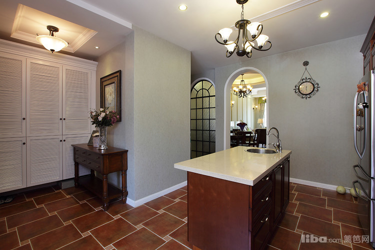 深红色的实木橱柜配以仿古的同色地砖,在敞开式厨房区域增加一个中岛台,让厨房空间利用达到最大化,也增加了料理台的操作空间,更加实用。