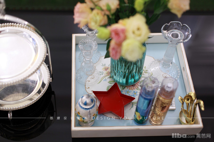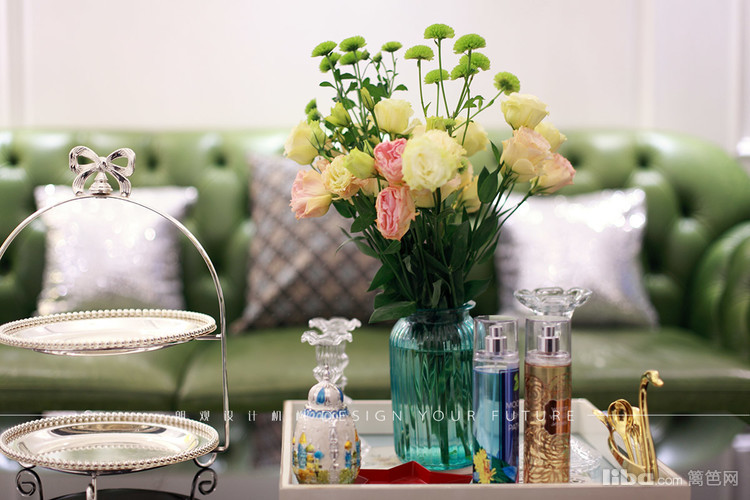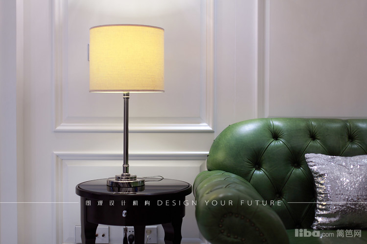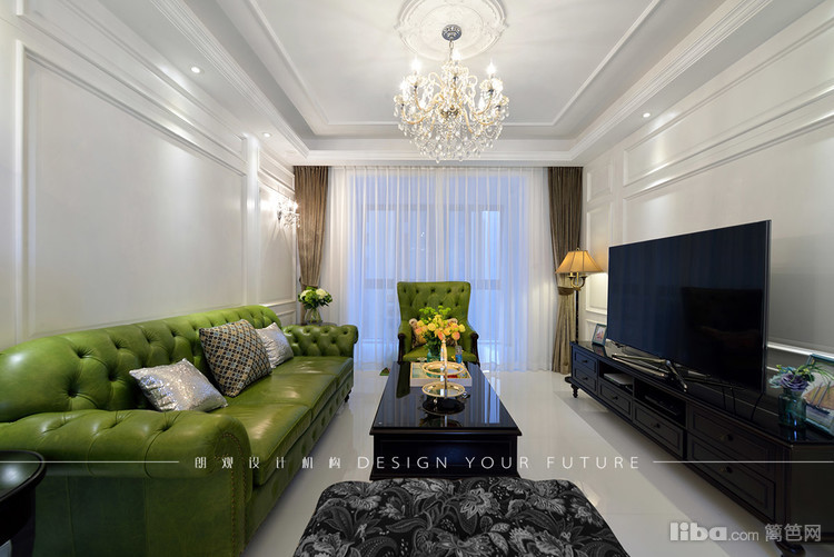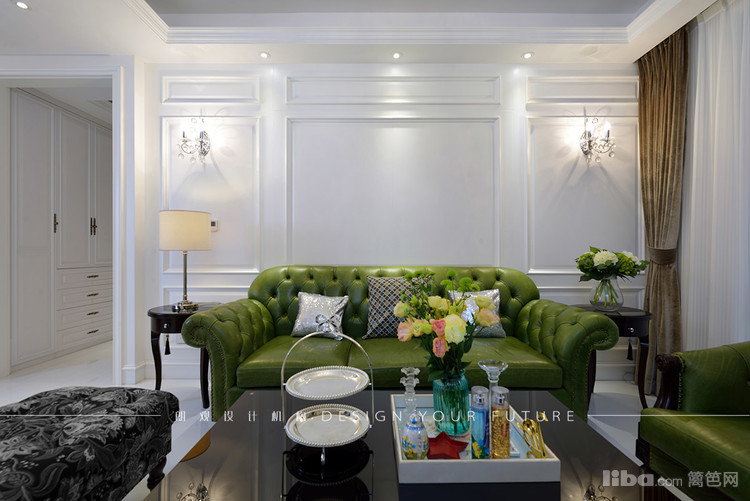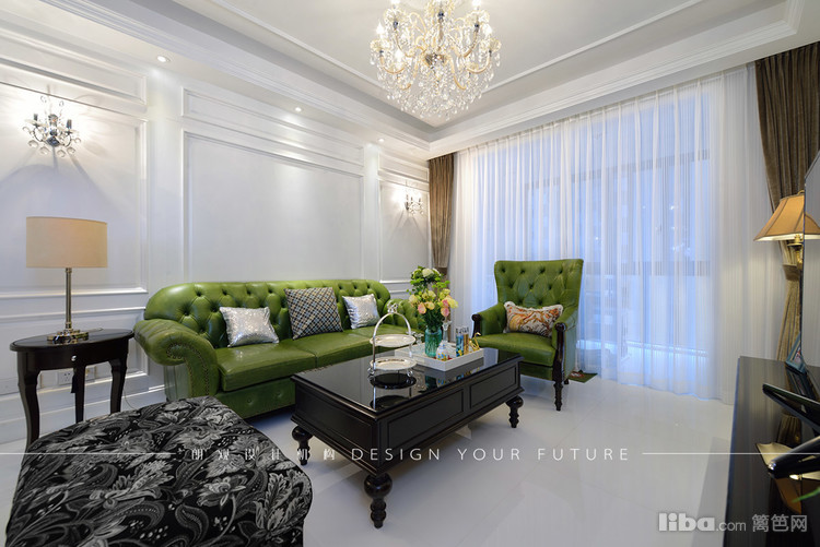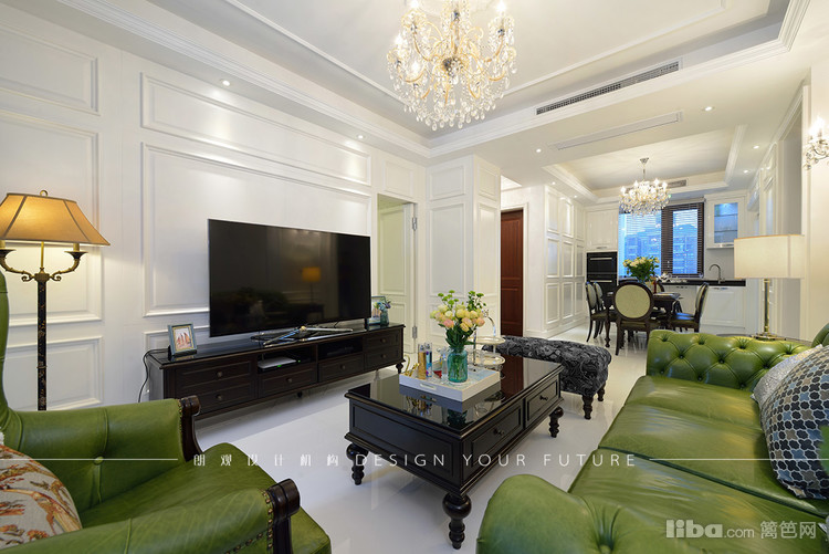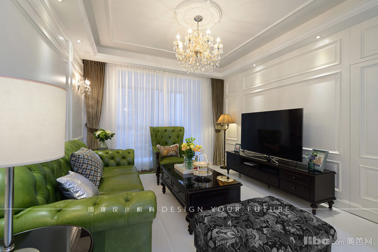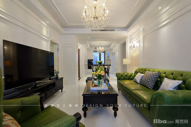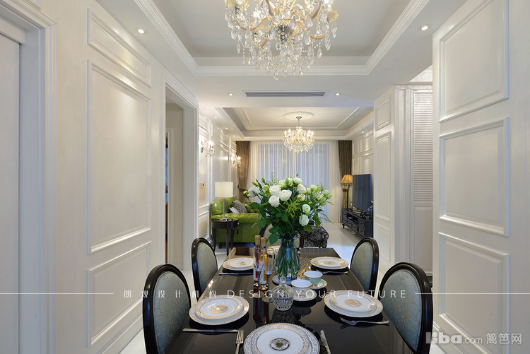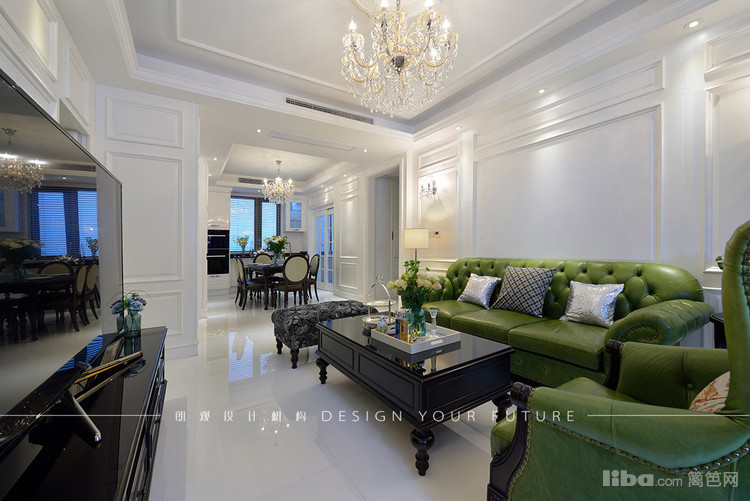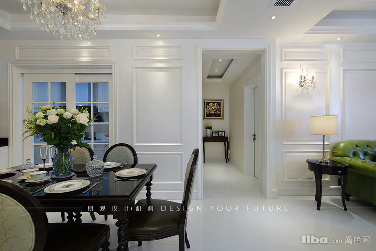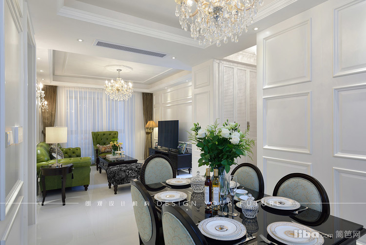 客厅区域作为一个家里使用频率最高的地方,自然成为最为出彩的地方,白色护墙板,华丽的水晶吊灯,绿色的复古沙发,配以黑色的茶几,让整个空间更加充实,富有质感~