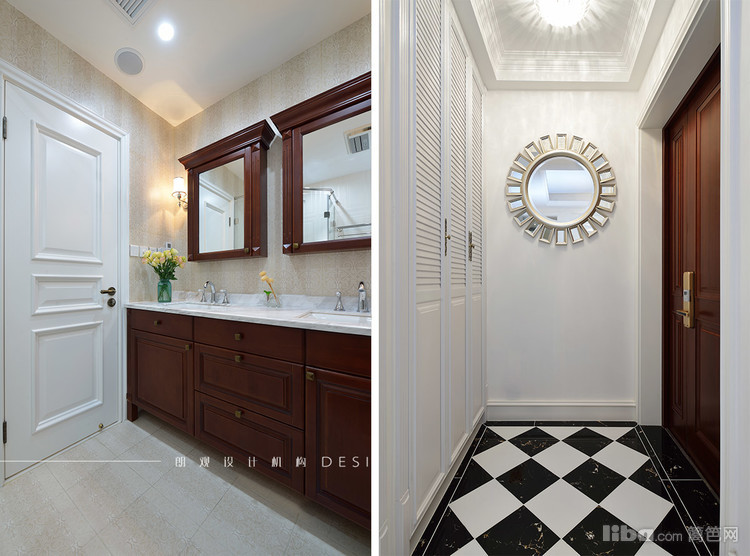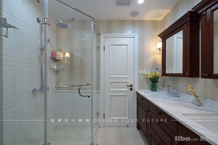 卫生间采用实木的双台盆,方便了家人使用,淋浴房采用菱形的设计既节省了空间,有增加了洗浴空间。