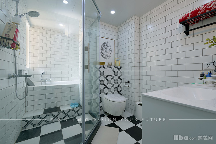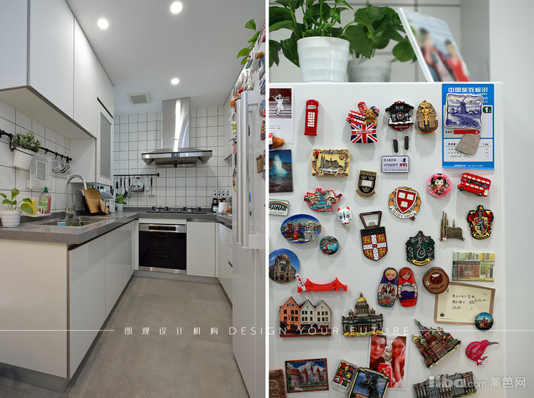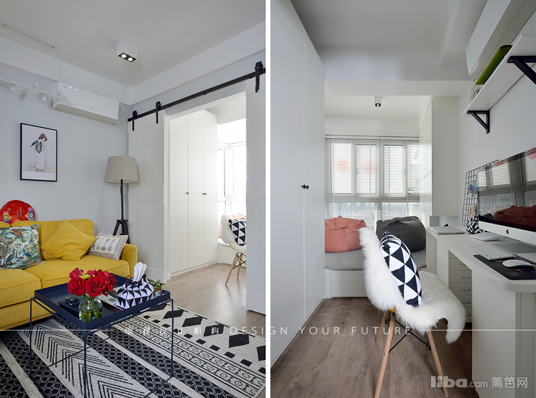 百搭的纯白北欧风配以鲜艳的软装,突显出年轻人的朝气蓬勃,谷仓移门将身兼储物间功能的书房与客厅隔开。