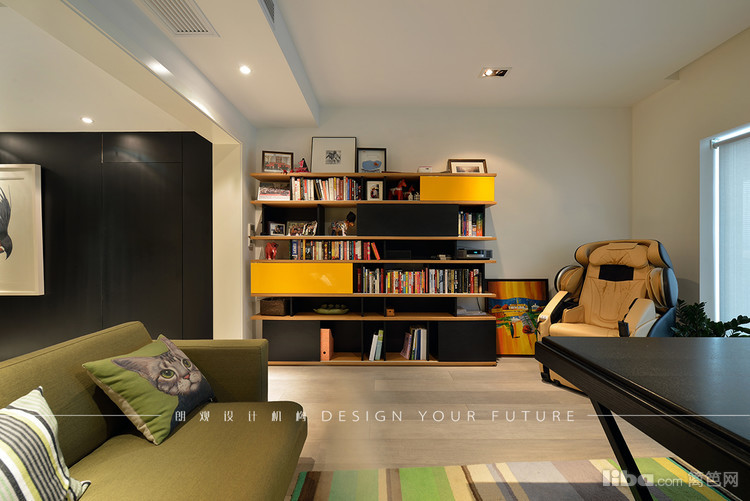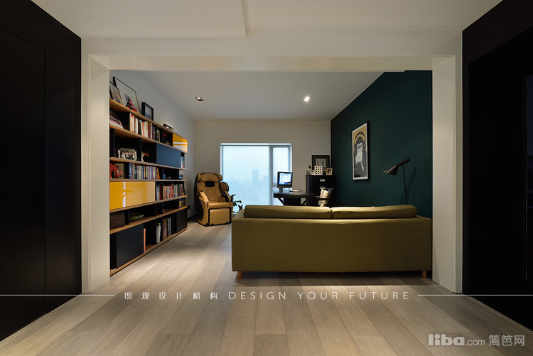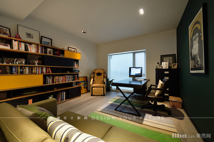 书房设计有休息区和工作区,工作休息劳逸结合,点缀色主要以养眼的绿色为主,挂画可爱诙谐,调节整体气氛。