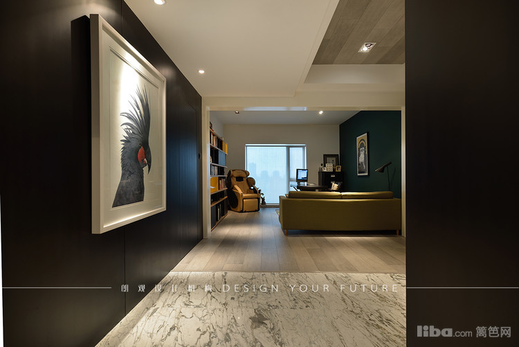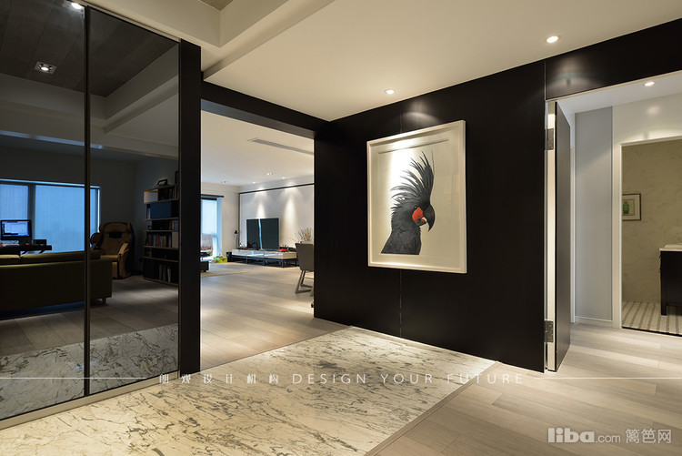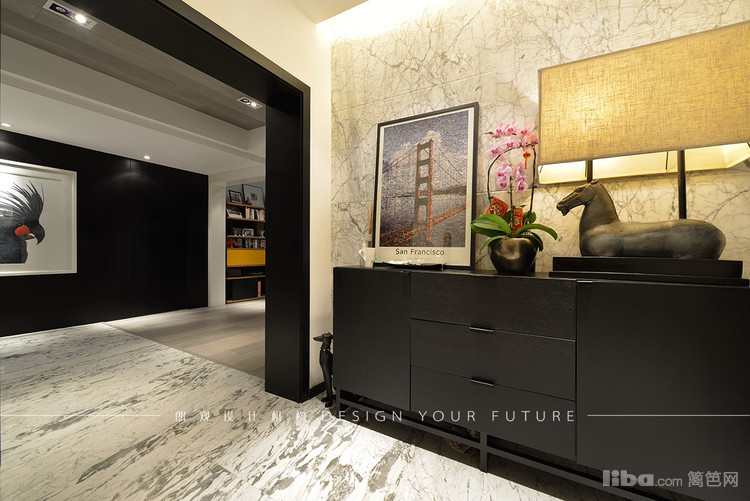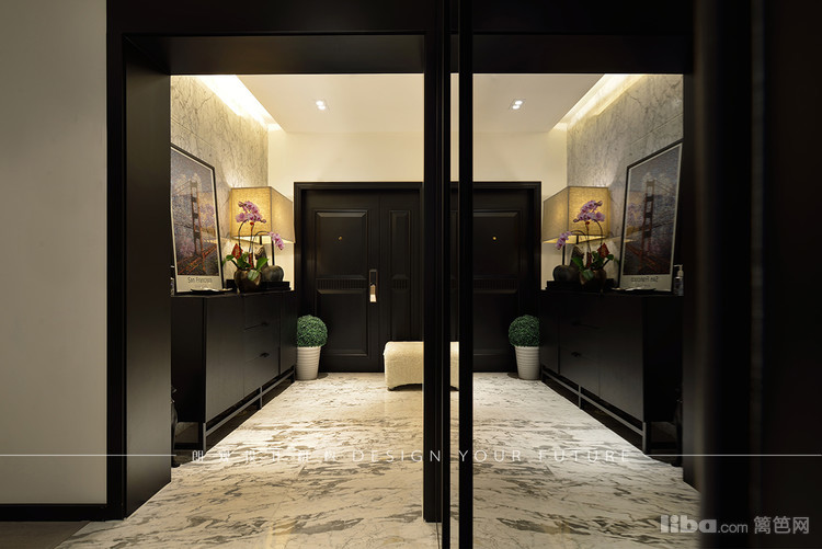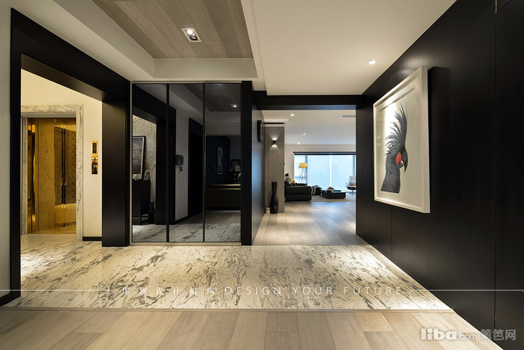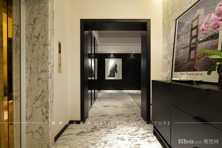 进门暖色灯光的渲染和长廊黑白灰的结合使空间大气豪华又不失简约,白色挂画使大部分的黑色元素少了沉重,多了灵动