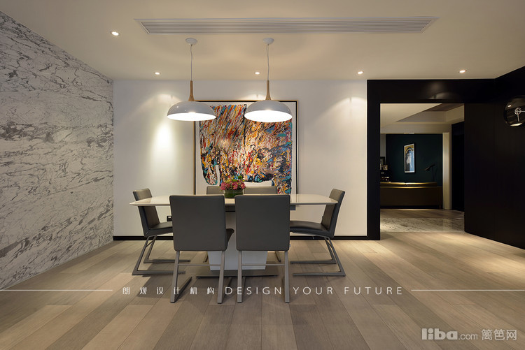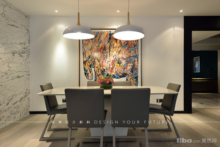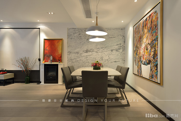 墙上的抽象派挂画使人眼前一亮,使空间活泼。桌子上的装饰物品也提亮的整体空间。在灯具的选择上也注重冷暖搭配,色彩呼应