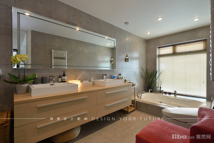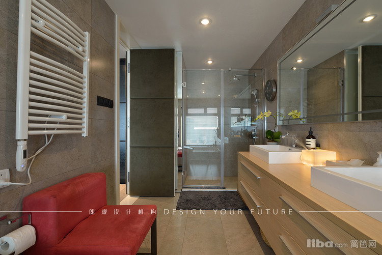 卫生间的设计体现典型的现代简约的风格,浴室的红沙发有种法国浪漫主义色彩,下沉式浴缸的设计,与洗手台形成鲜明对比,使空间不至于笨重。卫生间瓷砖的样式填补的空间的空旷感。