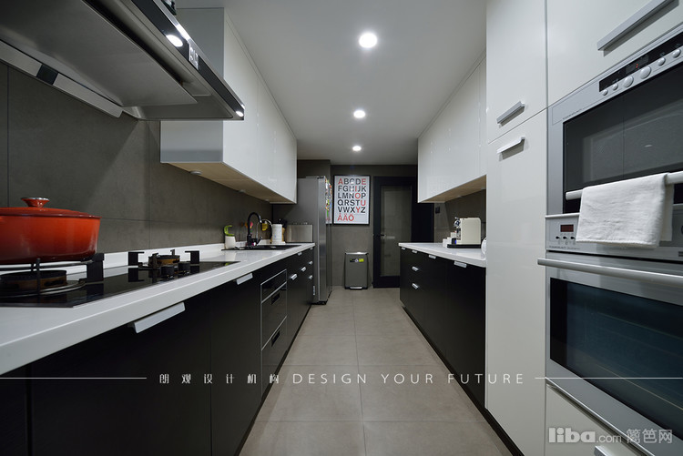 厨房把现在简约风格发挥地淋漓尽致,使整体打造简约又高档大气。红色的厨具搭配黑色的橱柜提升了整体的设计感。