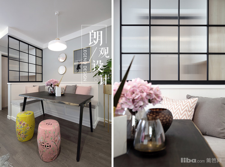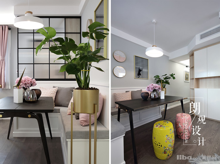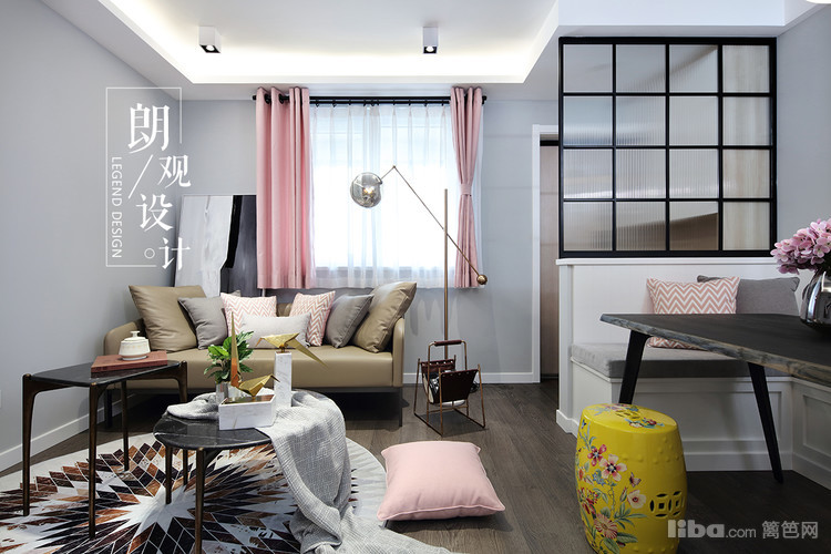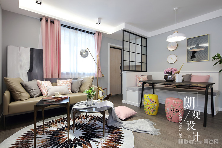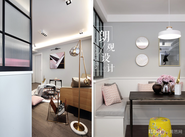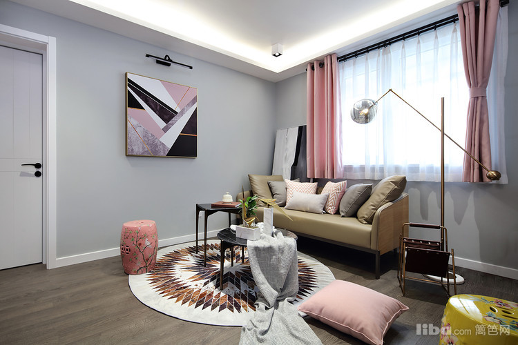 用粉色的软装柔和了灰色调,做旧仿古的家具以及皮质的沙发,金属材质赋予了整体空间视觉效果的多元化
