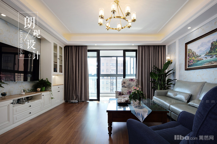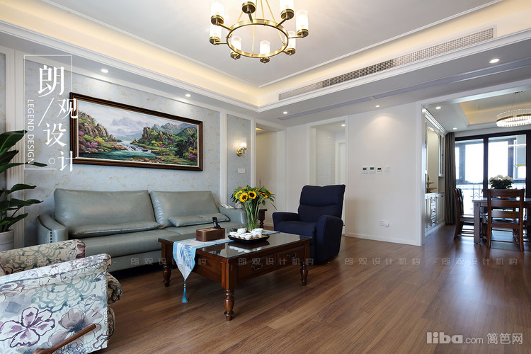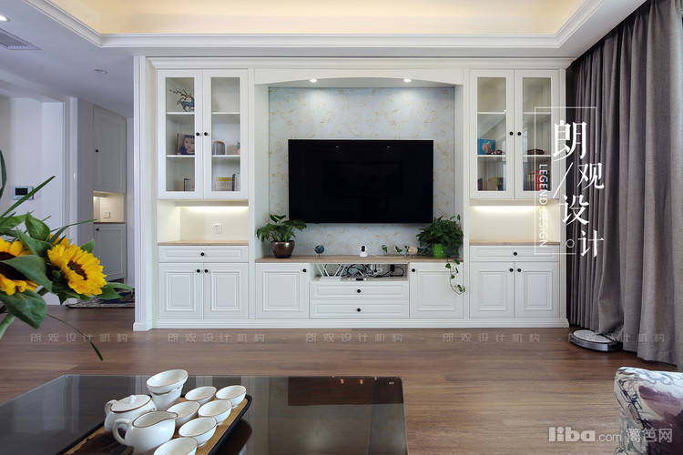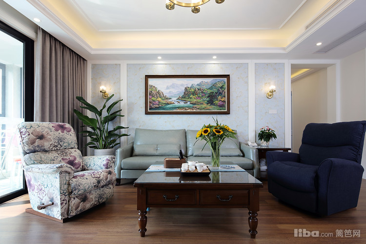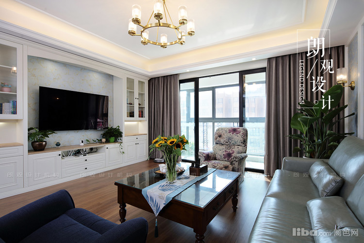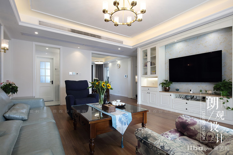 客厅皮质沙发配上两个布艺的单人位沙发,电视机柜是现场制作的,兼顾了美观和实用。