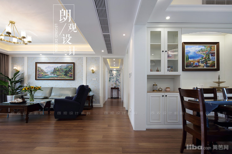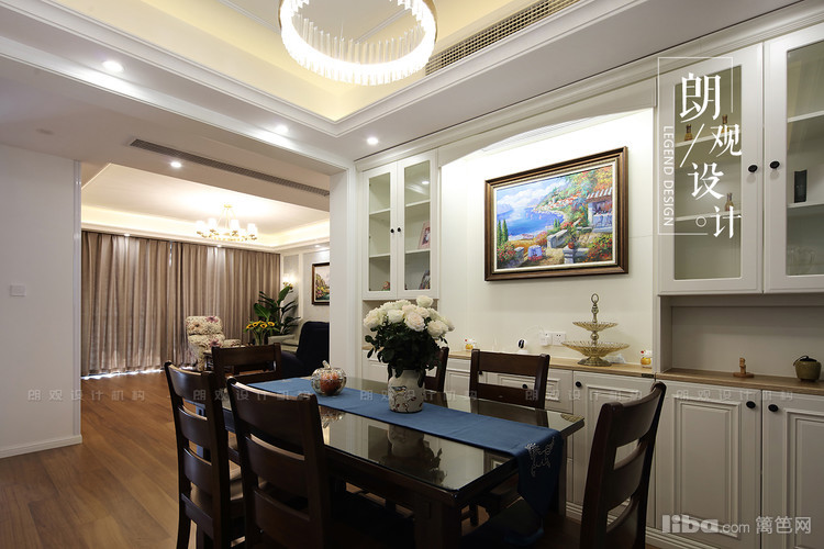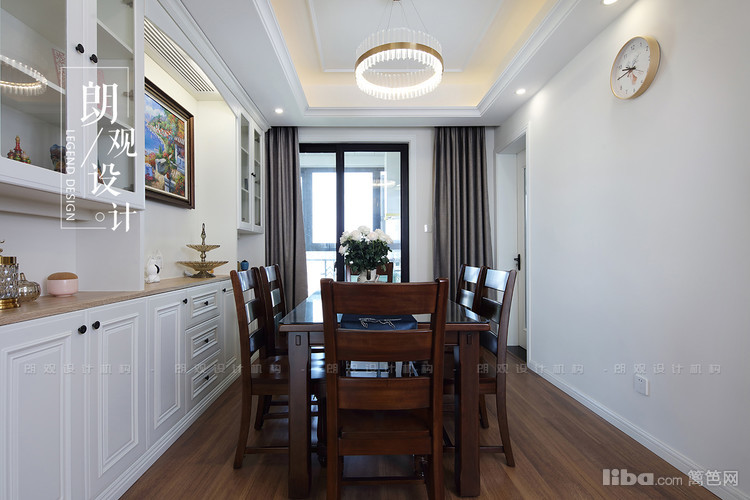 餐厅餐采用经典美式的实木款式,餐边柜设计了比较大的储藏空间,配上美式风格的吊灯,凸显温馨的家的氛围。