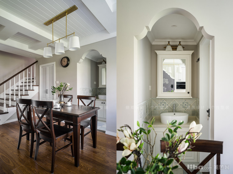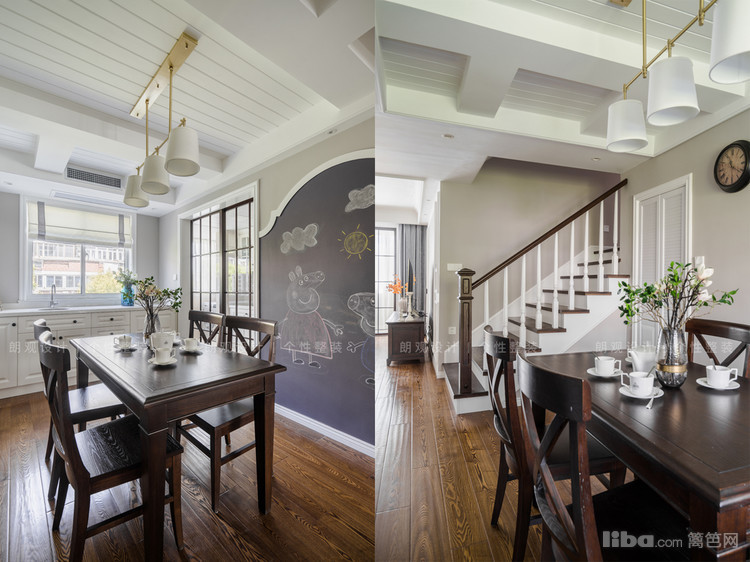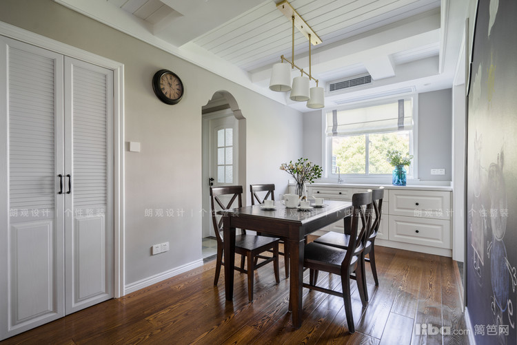 进门右侧是餐厅,和客厅整体风格上还是保持一致,实木色与白色奶咖色相搭,拱形门洞与黑板墙的造型形成呼应,让家充满情趣。
