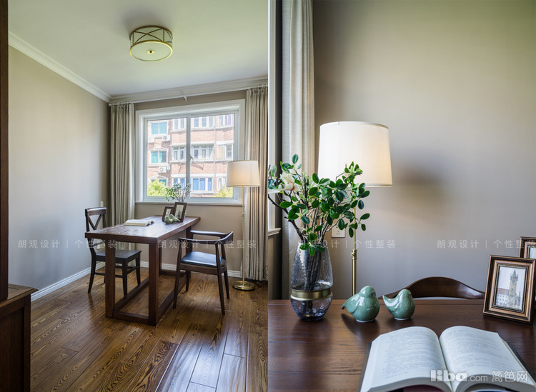 书房木质桌椅与布艺窗帘的温度,藉由光影的变化与渲染。桌上生动、别致的瓷质小鸟摆件,大俗大雅。