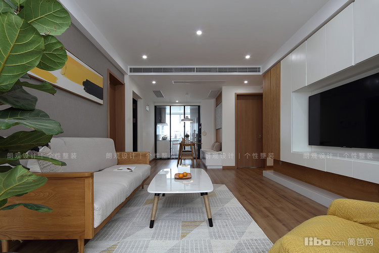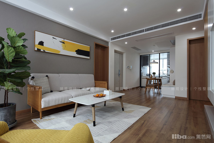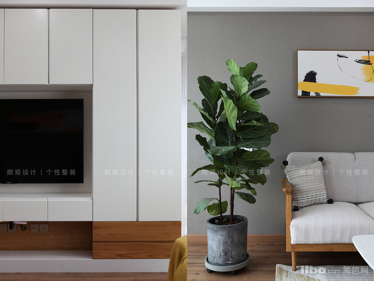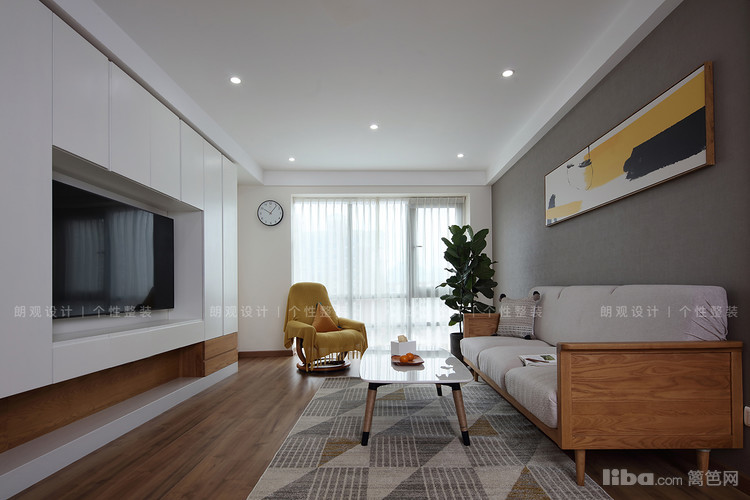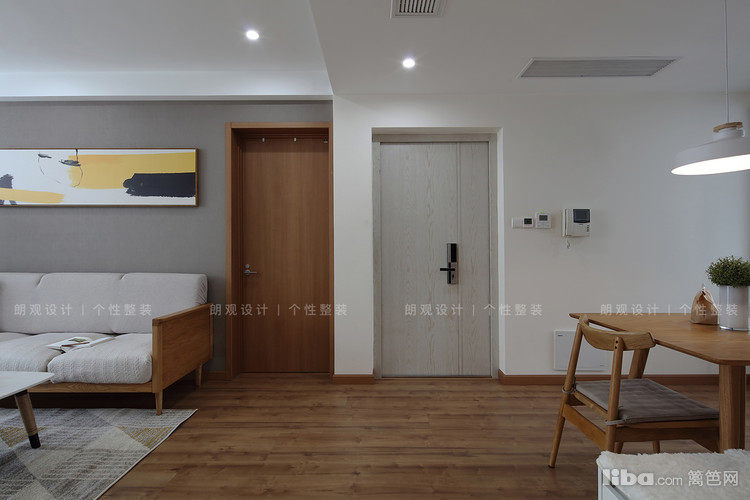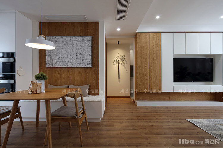 在风格效果上,整体空间采用大量亲近自然的白蜡木,以木纹色和灰色做基调,呈现出自然宁静风韵。为满足储物需求,在不影响空间效果的基础上增加了客厅储物柜。