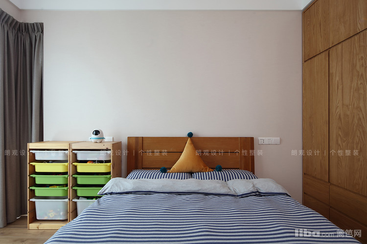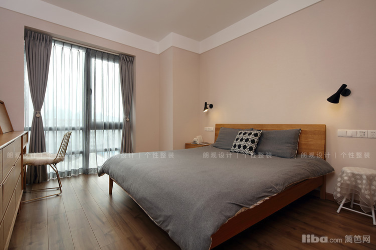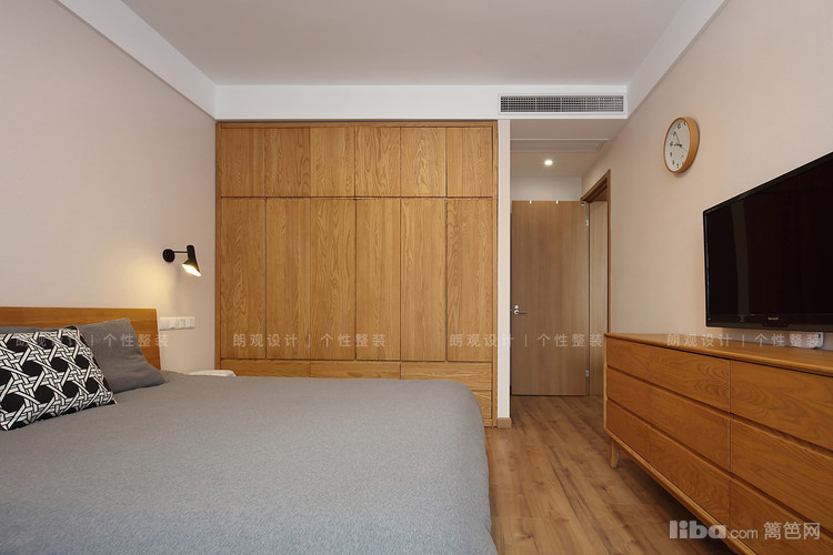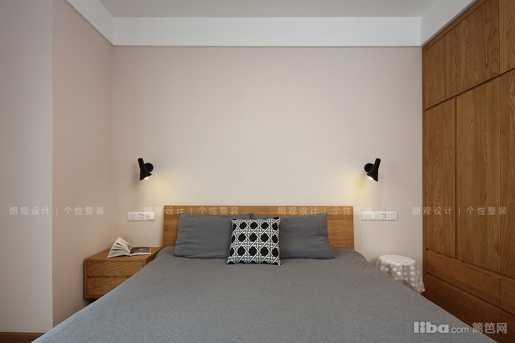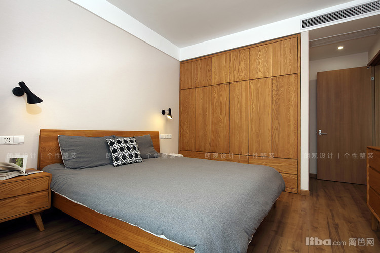 主次卧的灰色布艺和周围的木质衣柜同客餐厅相呼应,墙壁上的暖色光壁灯,方便起夜时照明,同时多了一份温润的感觉。
