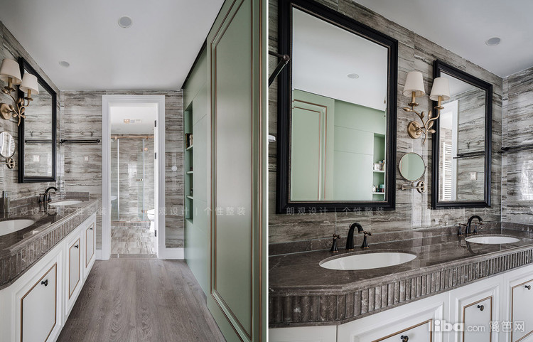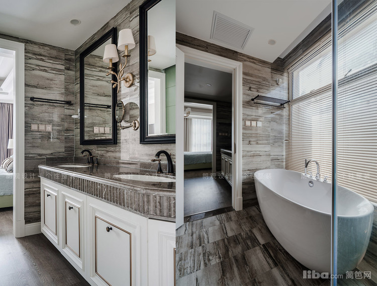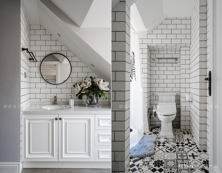 主卫空间搭配双台盆和独立的浴缸,墙地砖的颜色与整体风格呼应,体现低调奢华的风格。儿童的卫生间则以简约的小白砖配上花砖,清新整洁。