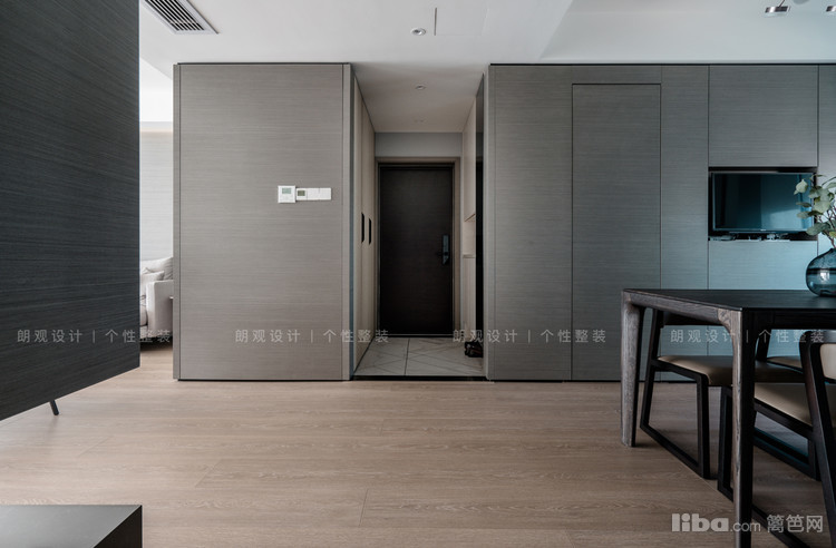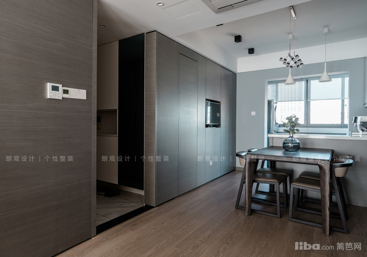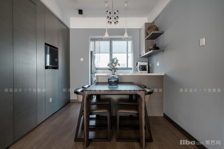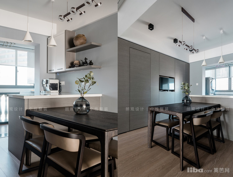 从门厅进入,左边区域为餐厅,餐厅和阳台相连,为了提高利用率,阳台设计成洗衣区,阳台和餐厅之间定制了小型吧台。餐厅主色调采用浅灰色,搭配实木餐桌,舒适温馨。