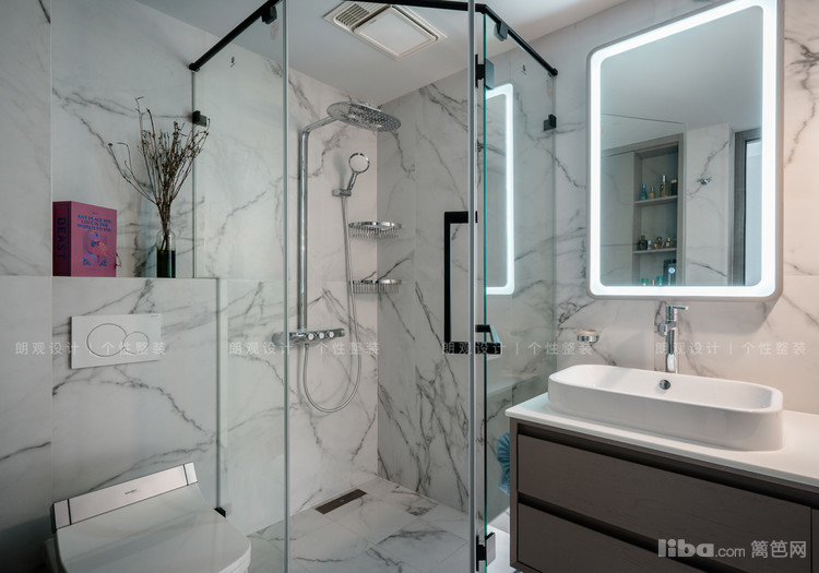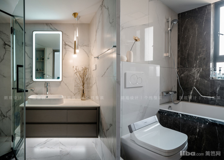 主卫设计在主卧套间内,原始设计面积较小,局促感明显,向卧室扩展后,功能齐全。象牙白大理石纹路瓷砖搭配品质洁具、金属质感吊灯,整体空间干净利索,时尚舒适。