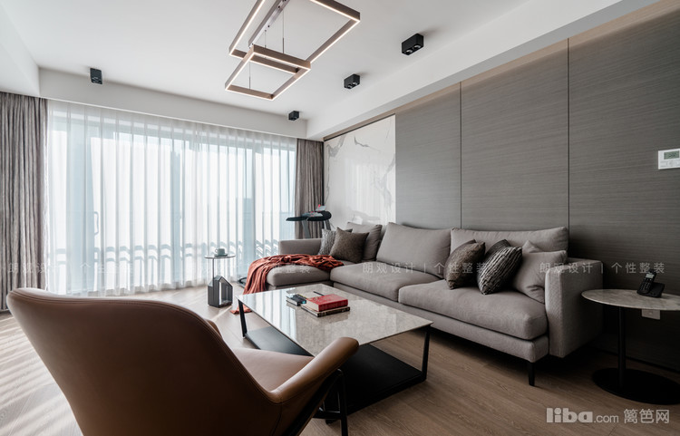 客厅以灰色作为主基调,沙发背景墙,大理石与木饰面的碰撞,彰显沉稳大气,简约与时尚,折射卓尔不凡的家居韵味。深咖色单人座椅为客厅增加了靓丽的色彩,提升了整体空间的明亮度。