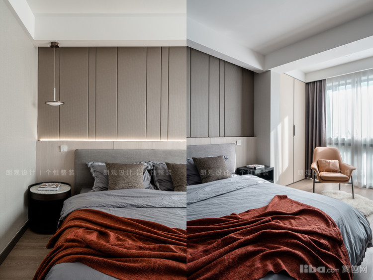 主卧空间内包含黑白灰三大色系,设计师将色彩运用到极致,深灰色背景墙,浅灰色床品,黑沉稳大气!