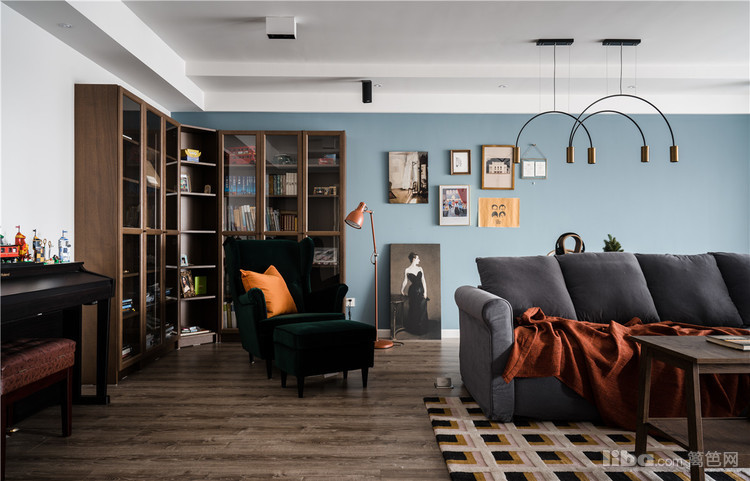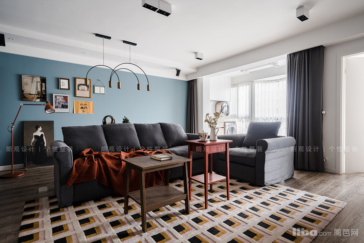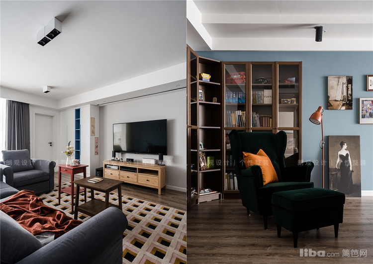 客厅开放式的格局奠定开阔敞朗的空间感,整体色系以浅蓝色、白色与灰色筑起静谧舒压的氛围。客厅面积虽大但是储存空间少,所以在电视背景墙定制了一组半封底半开放的储物柜。