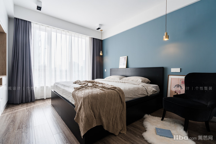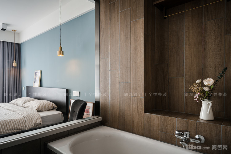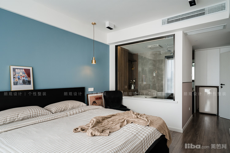 主卧房色调延续客厅的冷色系,浅蓝色的漆面床头墙搭配金色质感的吊灯,为简约的墙面创造视觉亮点,散发舒适无压的休憩氛围。淋浴房与卧室之间,采用玻璃窗设计,视线通透。