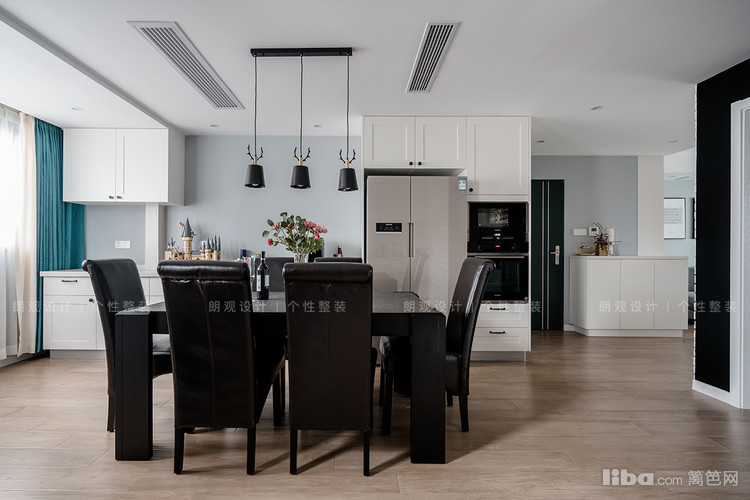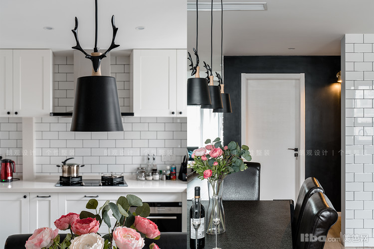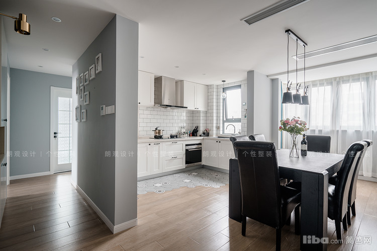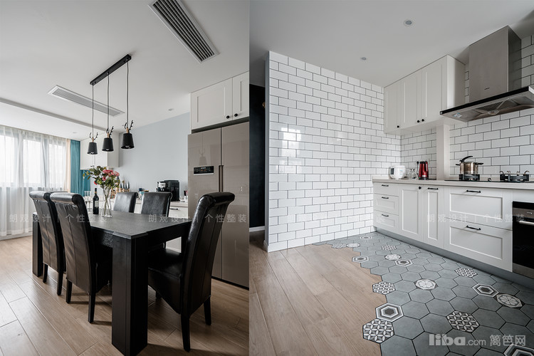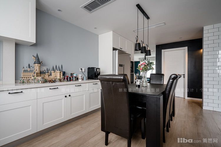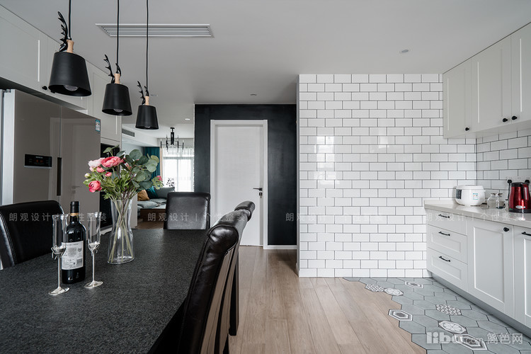 餐厅与厨房选择开放式布局,将柜体贴边摆放,保证了光线的穿透无阻,白色调的厨房区带来清爽洁净的视觉感受,并通过木元素与墙砖的对比,营造出丰富的层次感。