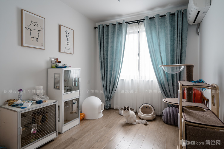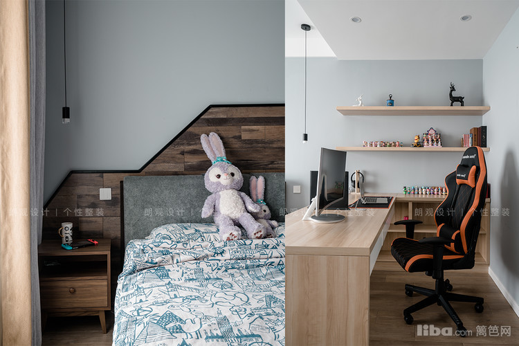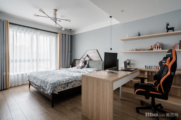 卧室床头柜、背景装饰和挂架都添加了木质元素,给卧室带来了温馨自然感。在挂架的一侧留出一排开放式的书架、展示架,在使用上更为方便。