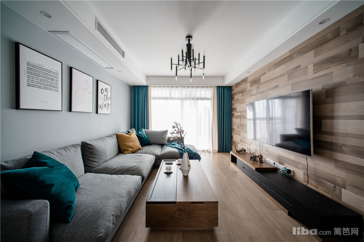 客厅以浅灰色沙发为主体,气氛稳定舒适,加入蓝色元素更显质感,配一把木质茶几更添自然。
