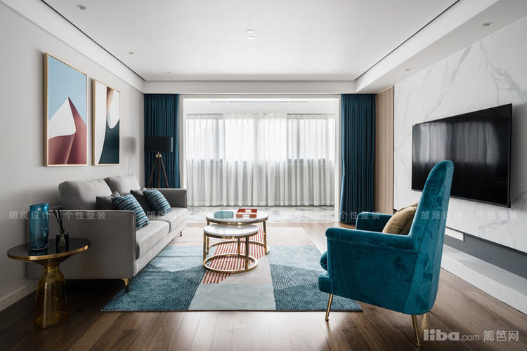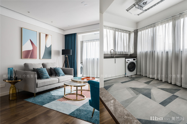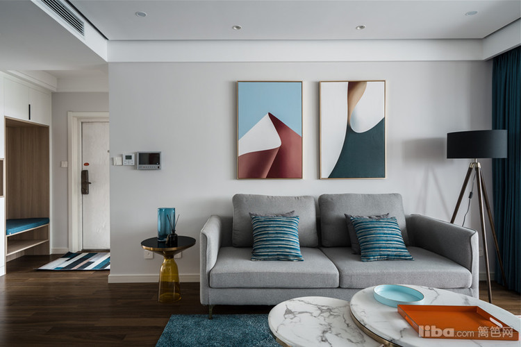 客厅用暖灰色做主色调,搭配浅灰色布艺沙发,营造温馨祥和的居住氛围;选择蓝色窗帘以及色彩明亮的装饰画,仿佛为空间注入了一剂轻松欢快的氛围,搭配少许的金属元素,提升空间的时尚和质感。