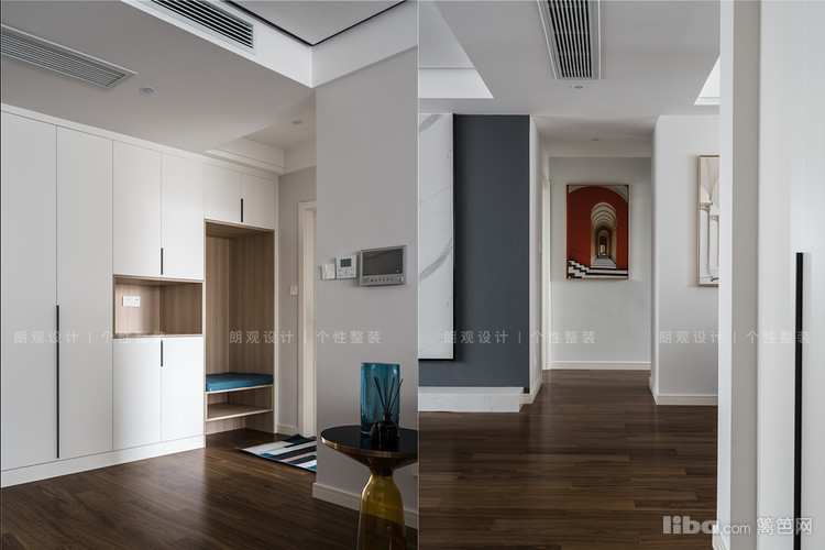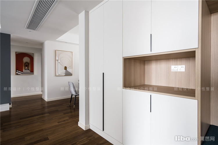 进入门厅,一幅色彩靓丽的现代装饰画映入眼前,为空洞的白墙增添灵气。玄关处将储物柜+鞋柜+换鞋凳,融为一体,选择白色烤漆面板搭配黑色半腰把手,兼具美观和实用性。
