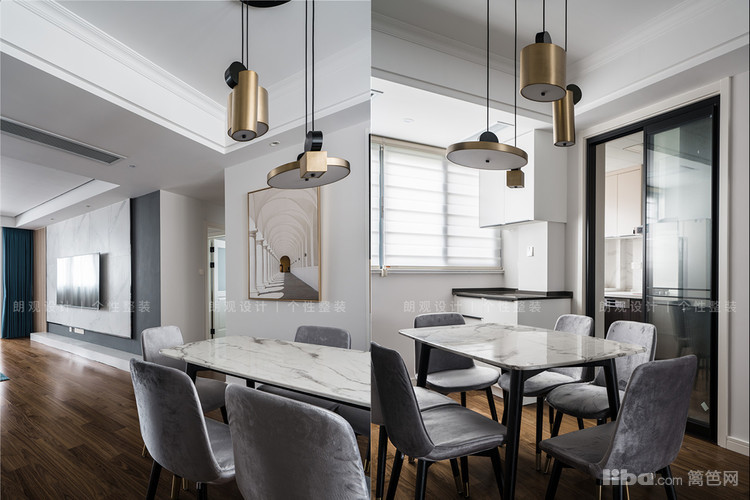 餐厅区域延续了客厅的风格,设计师更加注重用餐时的氛围。将北阳台纳入餐厅后,餐桌居中摆放,利用黄铜吊灯,营造温馨时尚的氛围。