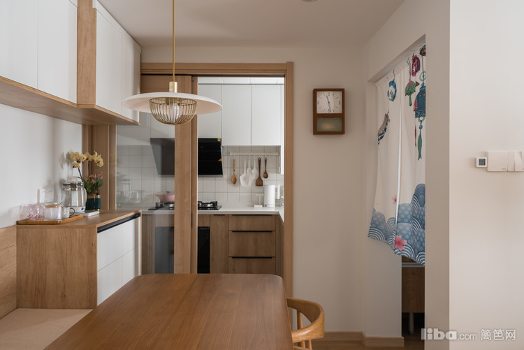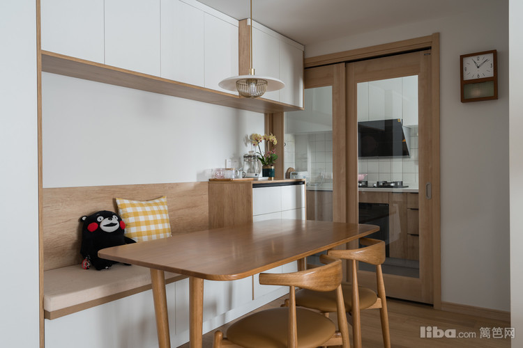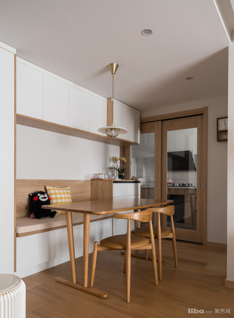 餐厅的空间不大,主要还是以餐厨储物柜为主,设计师选择了卡座的设计,将日常用品收纳于此,可以实现干净利落的效果。原木色与白色结合,餐厅客厅之间没有明确的界限,由餐桌作为简单的分割。