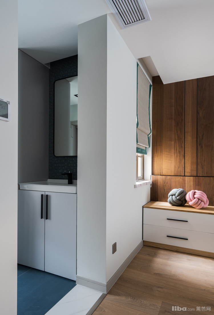 色调采用了莫兰迪的灰色系,搭配木纹色家具,整体看上去明亮温馨。