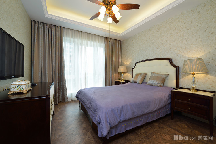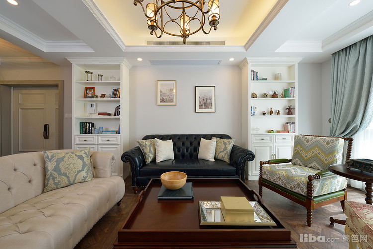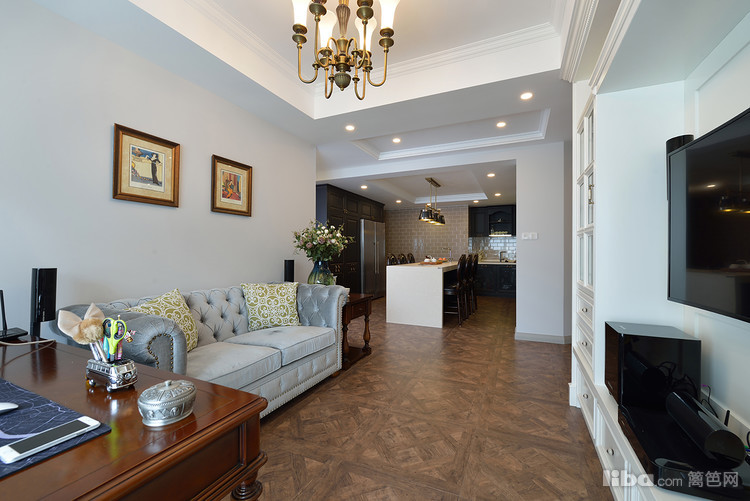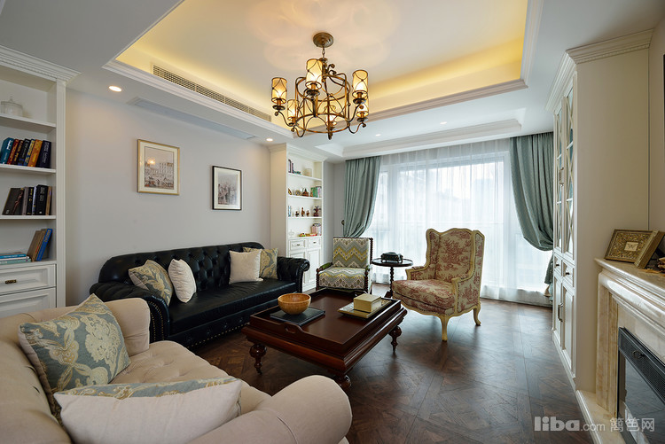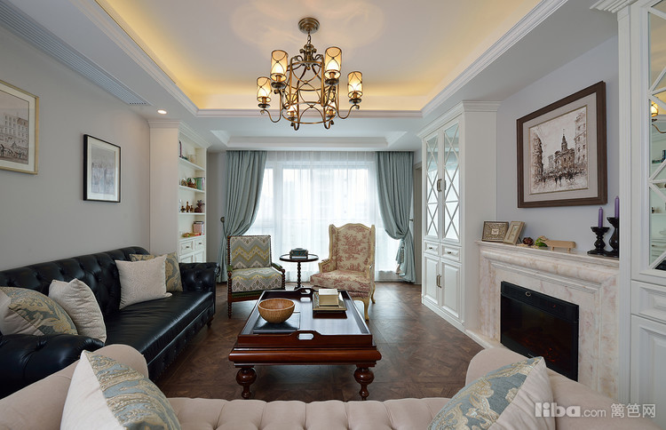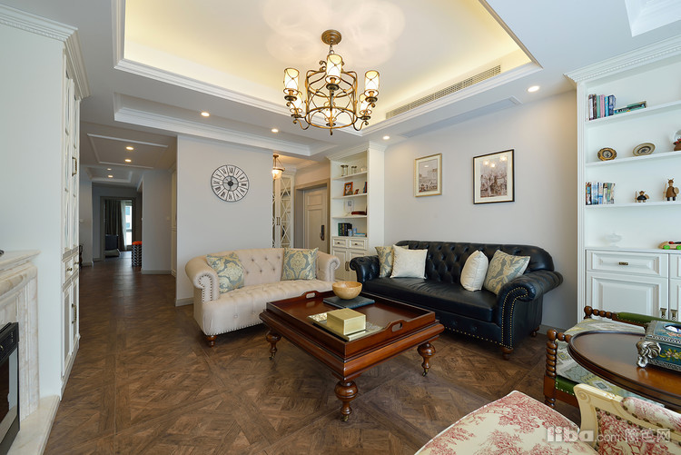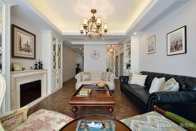 复古的拼花地板、实木造型线条以墙面挂画将浓郁的美式味道引入眼前。壁炉的设计打造出经典美式风格,并借着两边的装饰柜增加了储物和装饰空间。