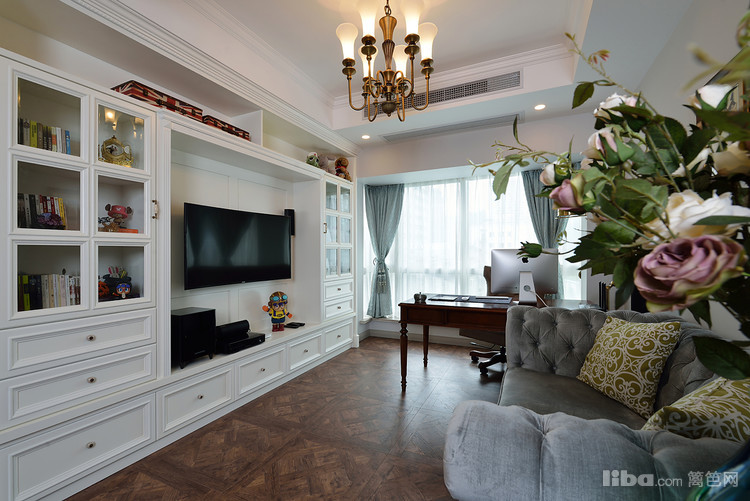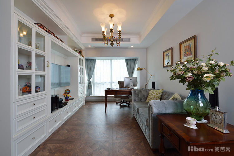 书房的一整面书柜的设计增加了摆放空间,玻璃柜门增加了设计感也便于打理。此外书房兼做客厅的功能,复古的欧式沙发和吊灯让整个空间更显大气和奢华。