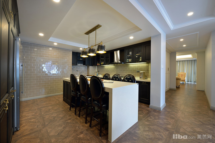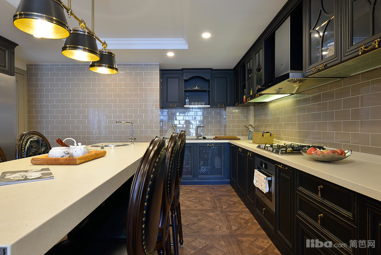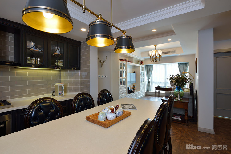 开放式厨房与餐厅融为一体,中岛的设计兼做了餐桌的功能,墙面灰色工字砖与黑色实木橱柜将美式风格演绎的淋漓尽致。