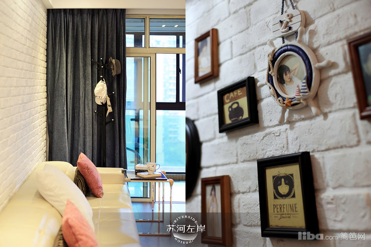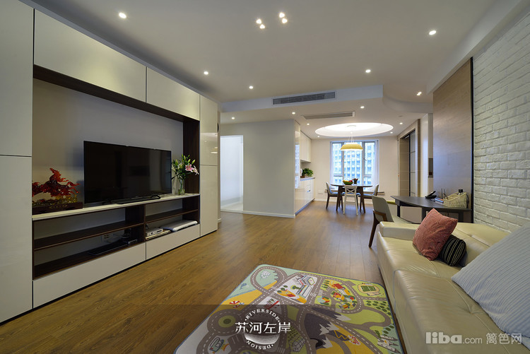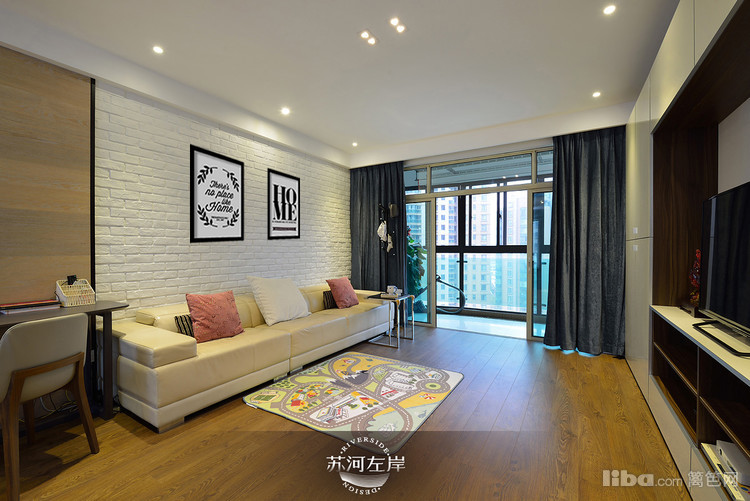 客厅电视机柜做成一面装饰墙,简单时尚又很实用。沙发背景墙采用毛砖处理,另类的时尚