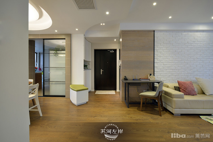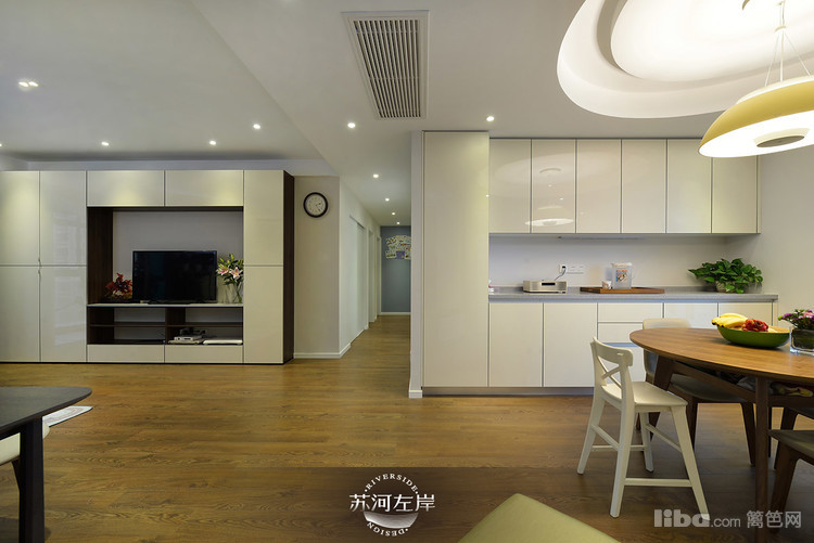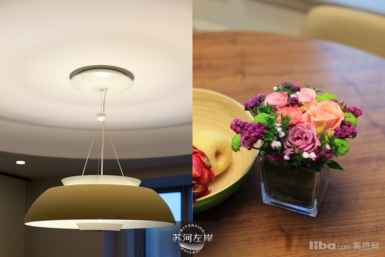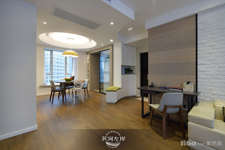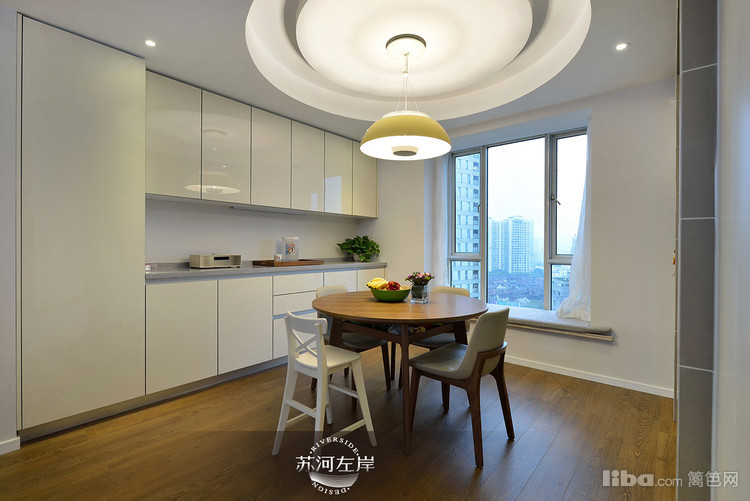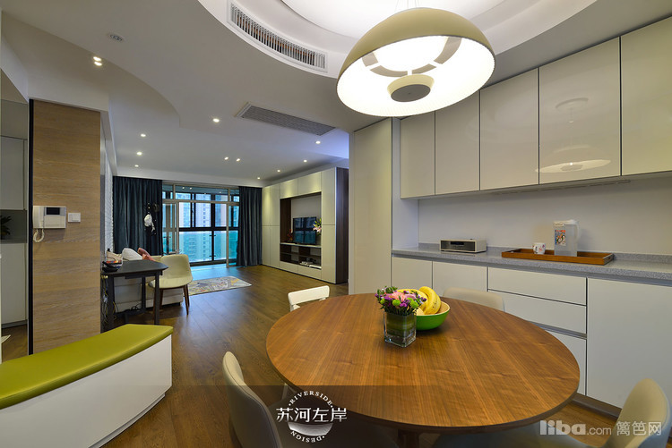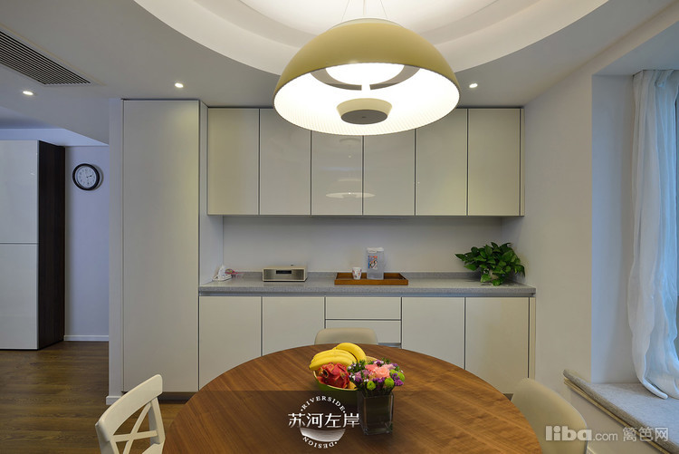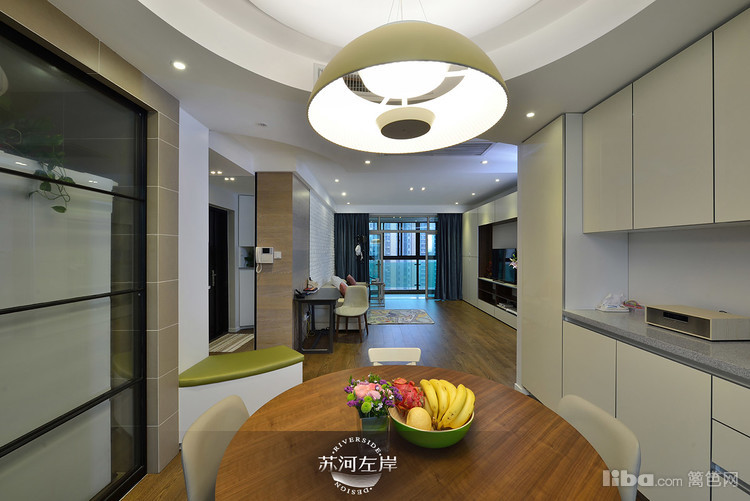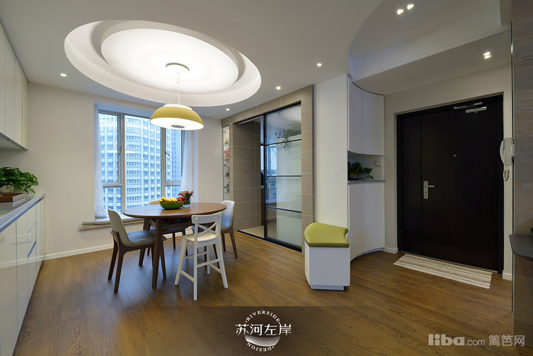餐厅采用圆形餐桌,吊顶也做了圆弧形的形成呼应,餐边柜做了整面墙,最大限度的满足储物需求。进厅处的穿鞋凳方便了使用,也成了进门的亮点