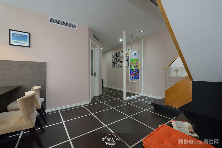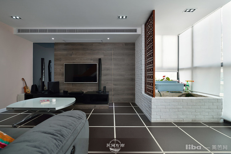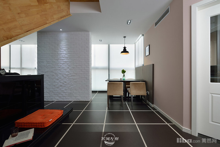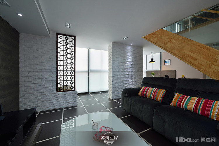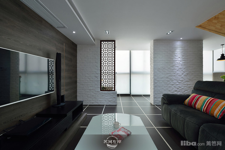 客厅黑色的地砖用白色的填缝剂形成了很好看的格子图案,给人清爽的感觉,黑色的布艺沙发采用条纹靠枕加以点缀,茶几选择白色,从而避免了整个空间的沉重感。