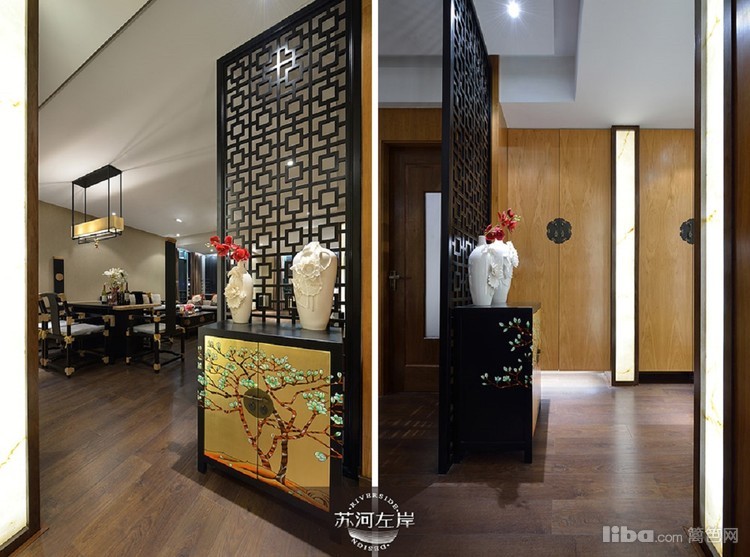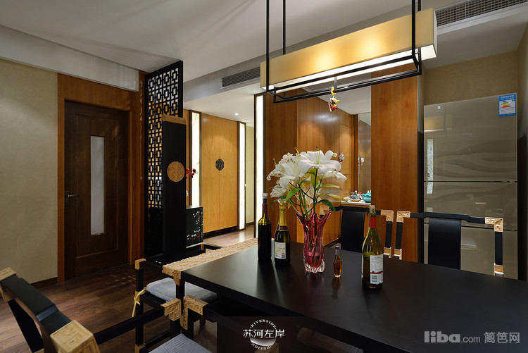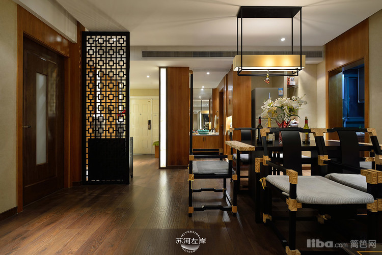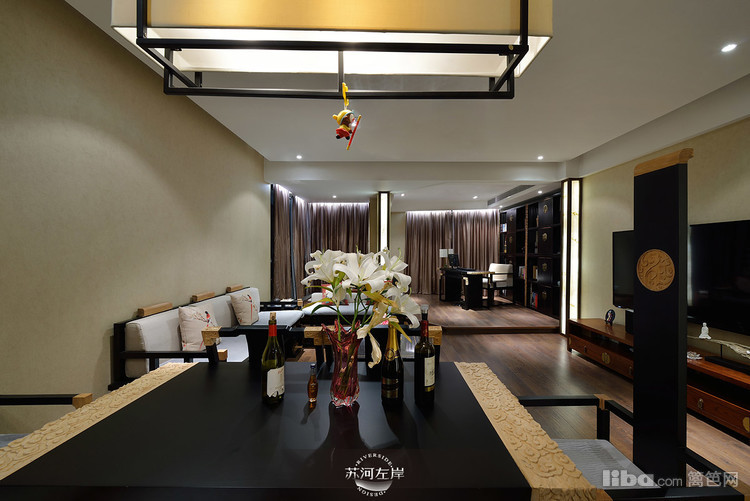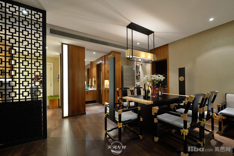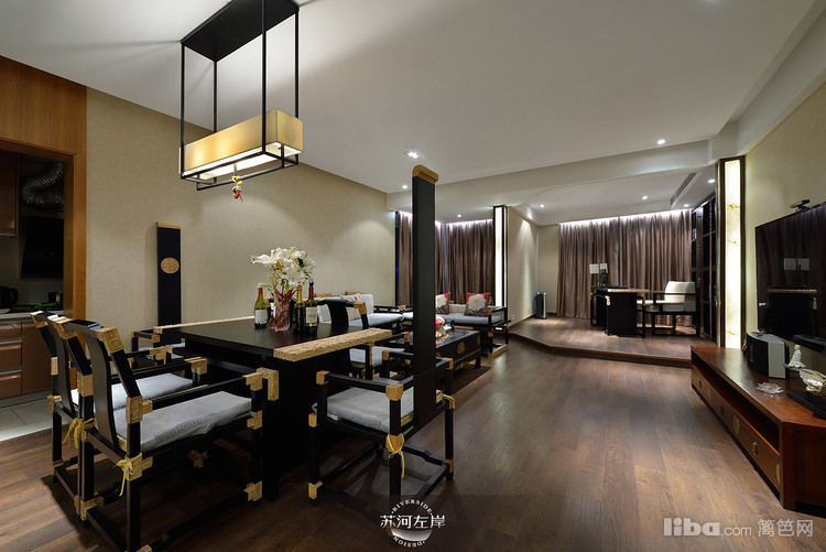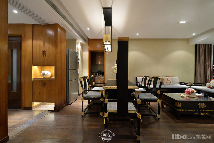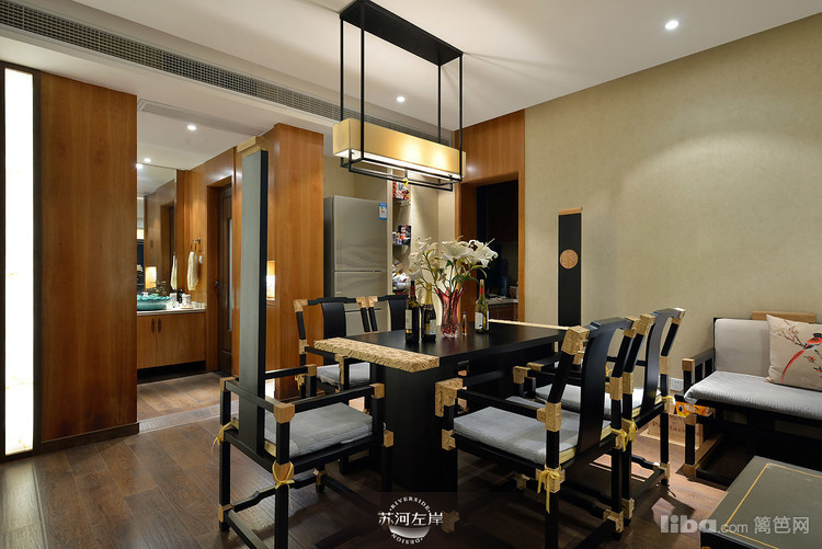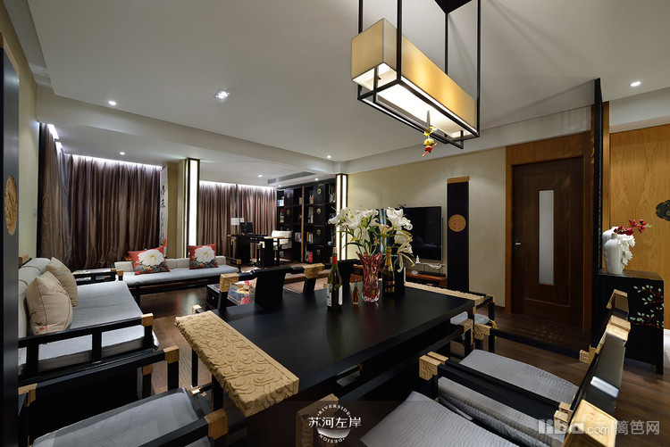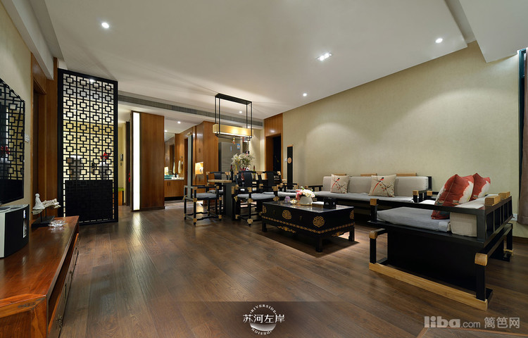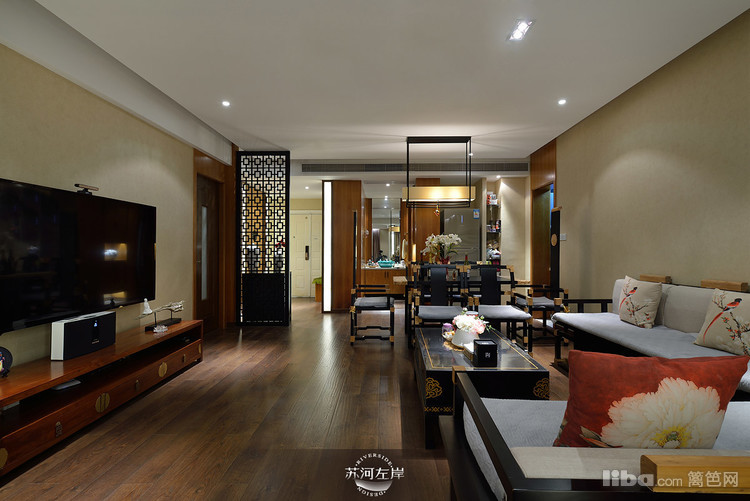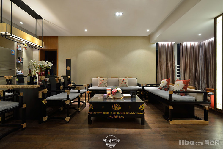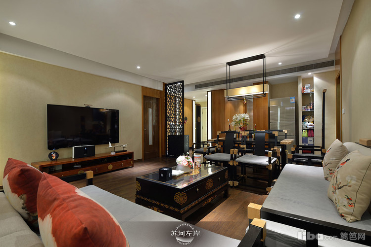 客厅选择的是木架的沙发和单人座,再铺上白色的垫子,显得干净、整洁!客厅家具的选择都是在新中式的基础上加以延伸。