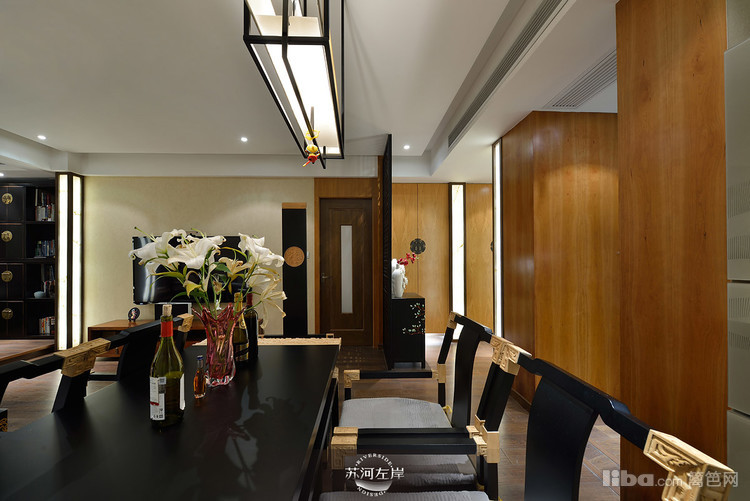 餐厅黑色的餐桌椅在金色的点缀下显得很大气,桌上白色的花艺为整个空间增添了色彩!