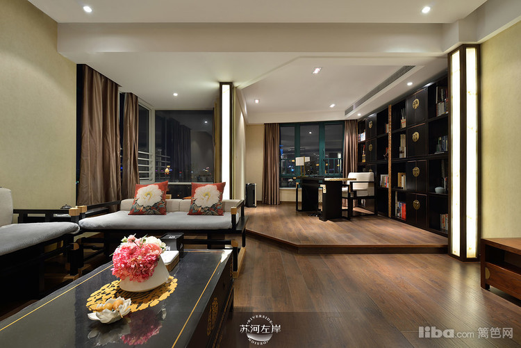 书房的地面高度在客厅的基础上做了抬高,从而进行了区域区分,书桌和书架的款式都是和家里其他区域的家具相统一。