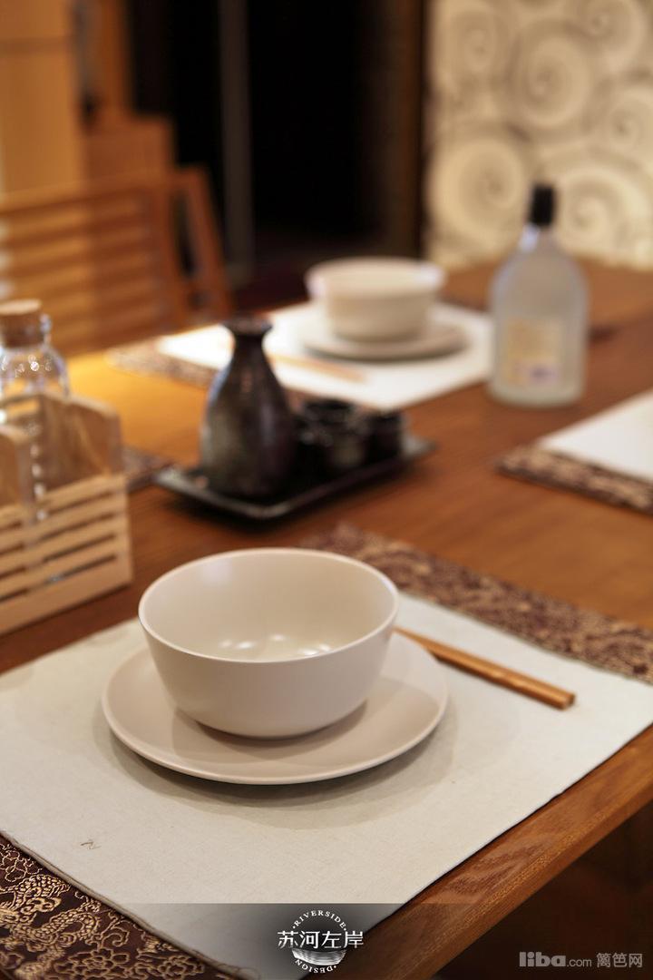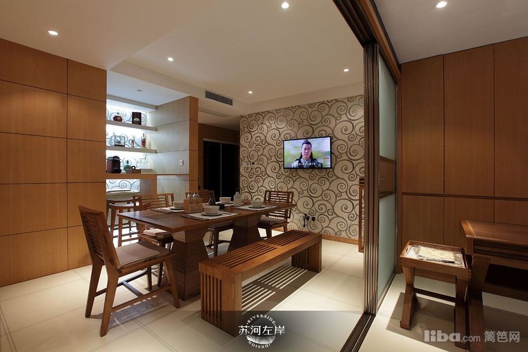 餐厅原木色背景中采用隐形门的处理方式,让空间上做了划分。