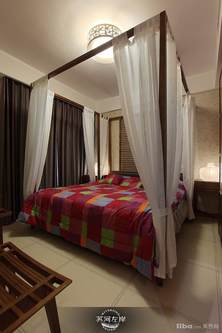 卧室墙面也是采用祥云图案的墙纸来装饰,还有四柱沙曼床,都是在不经意间诠释了中式风格中的禅意。