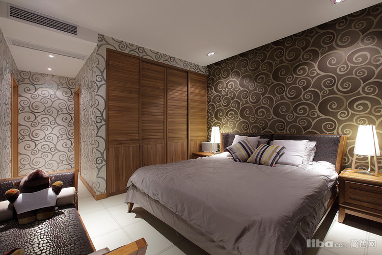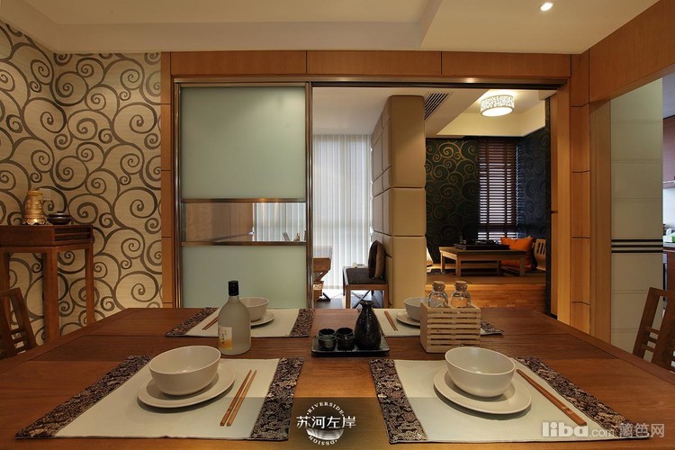 原木色饰面,祥云图案的墙纸,原木色家具,营造出自然的禅意空间。