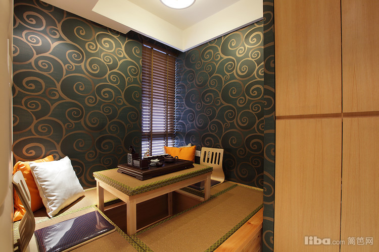 书房的榻榻米不仅增加了储藏空间,而且与墙面的祥云墙纸呼应,同样显示出禅意的感觉。