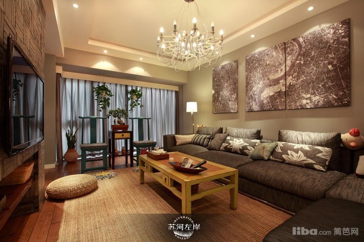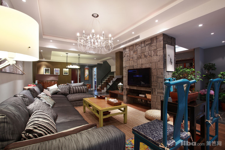 客厅采用中式元素与现代材质的巧妙兼柔,明清家具、水晶灯,水泥砖相互辉映,再现了移步变景的精妙小品。