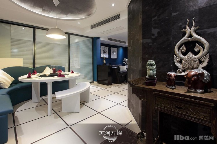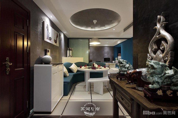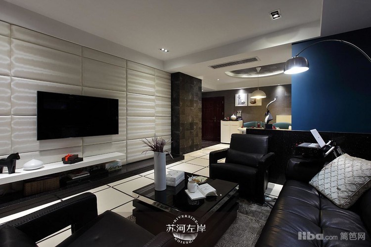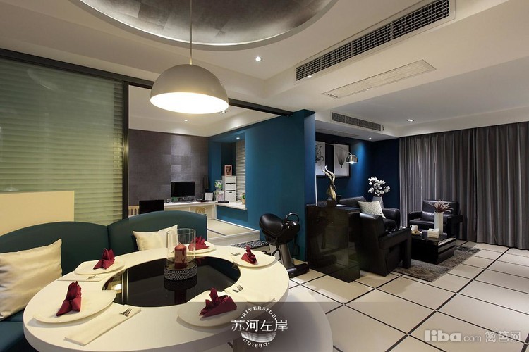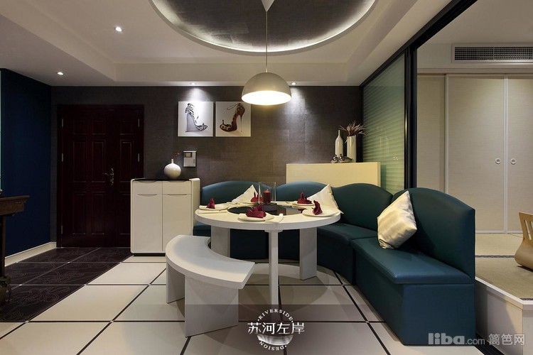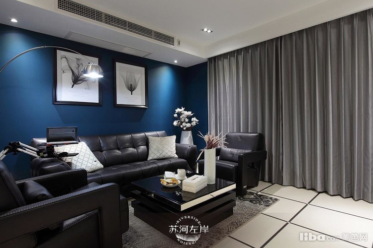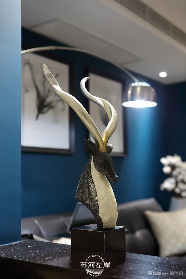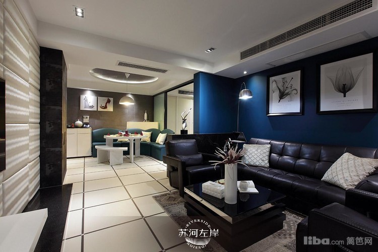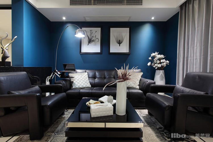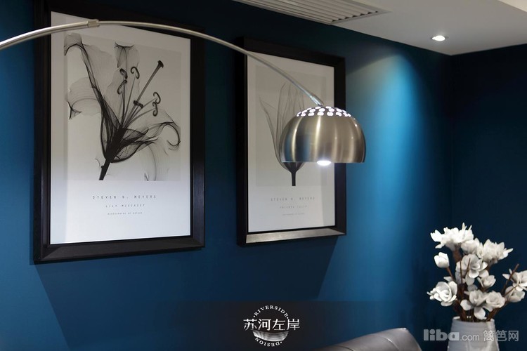 客厅的深蓝色成为整套房子的亮点,点缀白色装饰画,形成大胆的撞色。