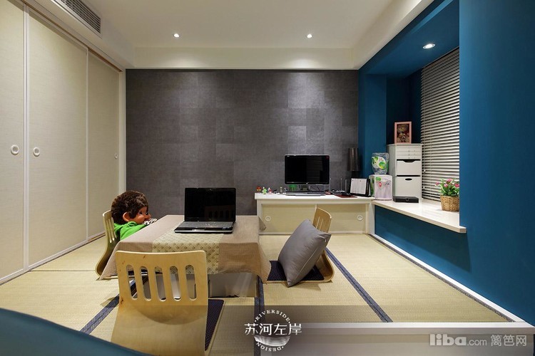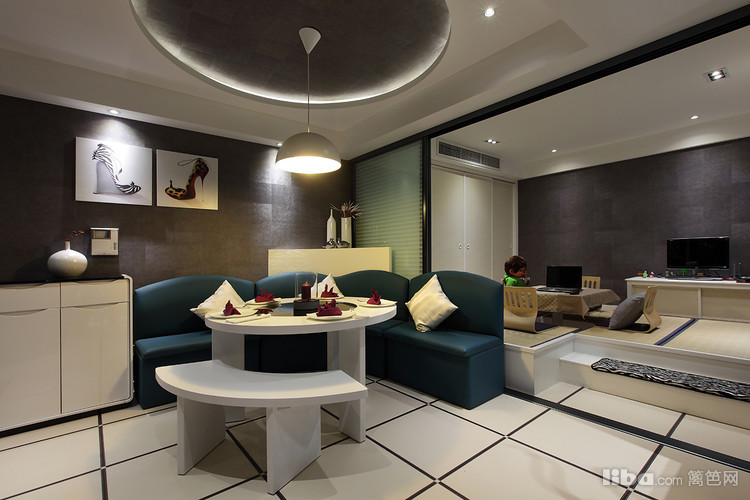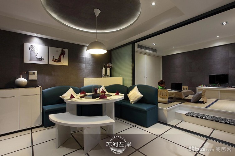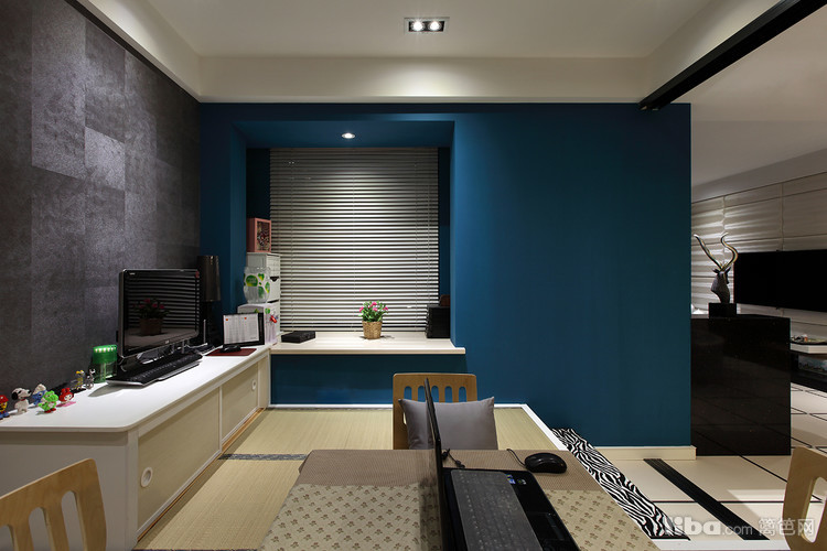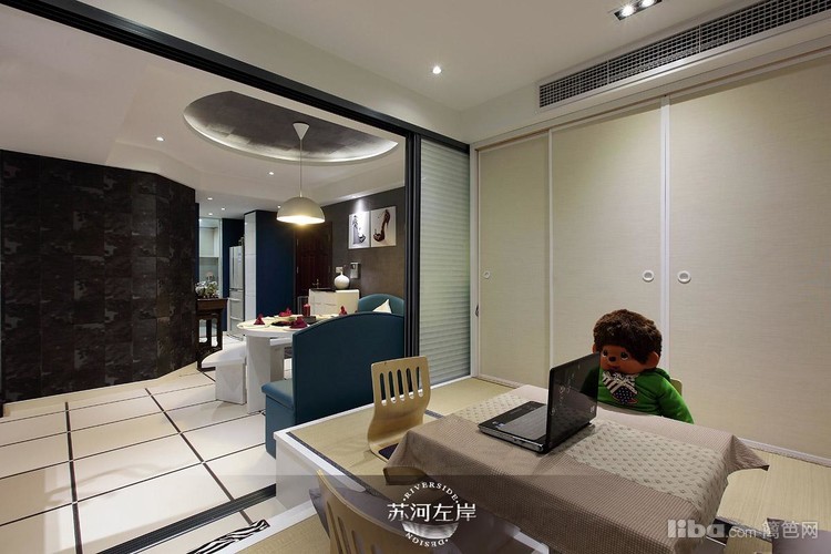 书房区域做成榻榻米,同时增加了储物空间,与餐厅用玻璃隔断门隔开,也可以融为一体,让空间更显宽敞。