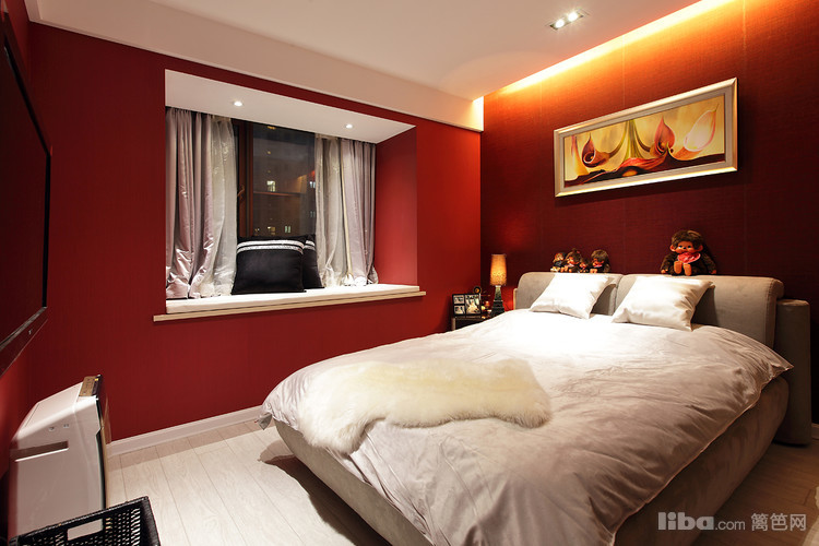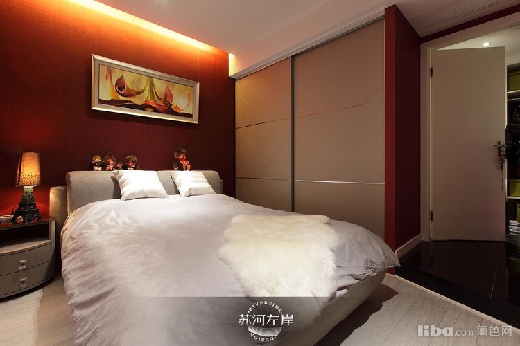 主卧的红色墙面则打造了温馨浪漫的空间,入墙式衣柜充分利用了空间。
