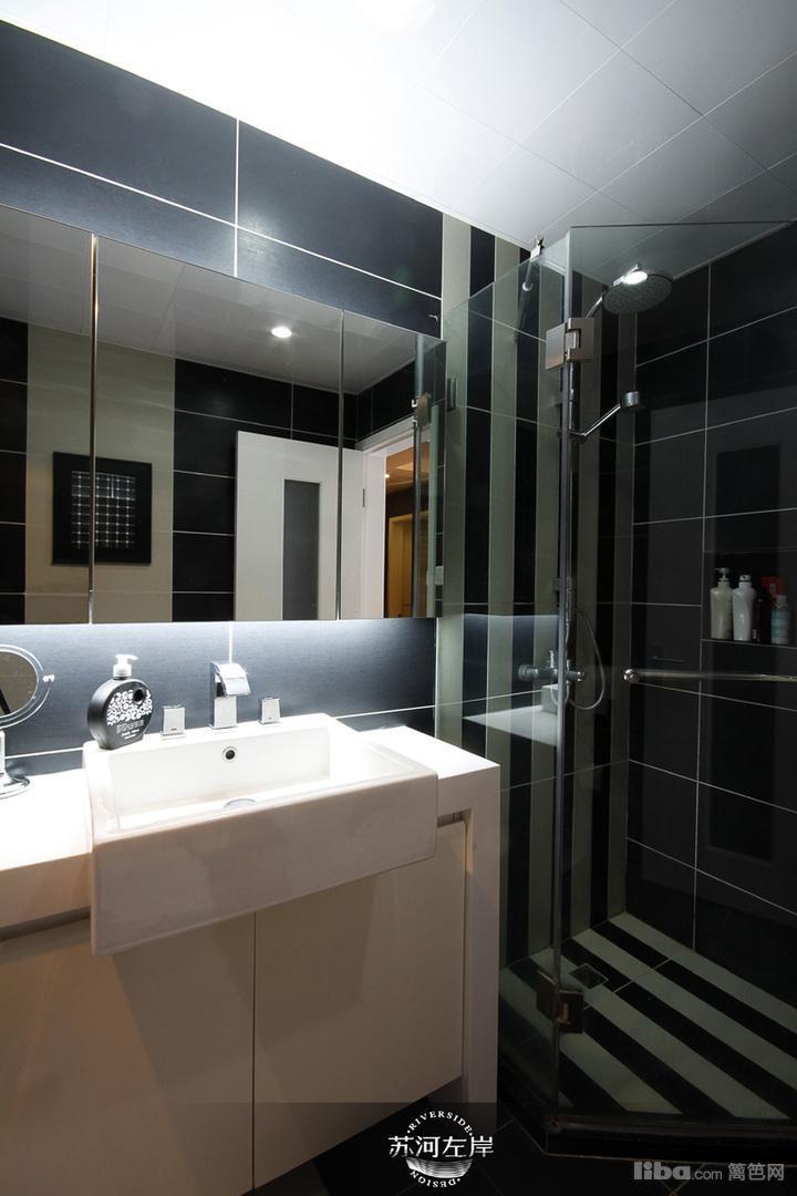 卫生间采用黑色墙地砖,与白色的洁具形成鲜明对比,更显个性与洁净。