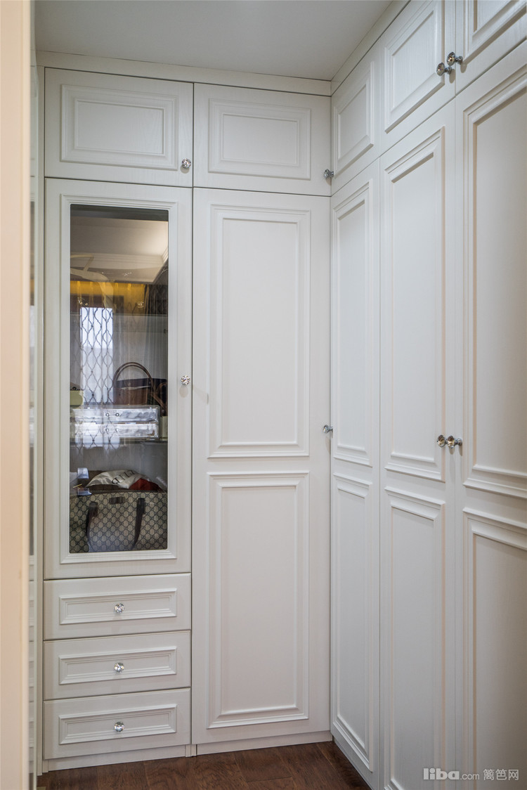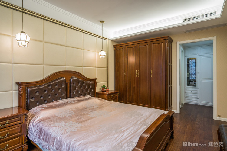 主卧室用中式的家具配以温暖的灯光,值得一提的是被精妙地安插在门口的洋气的衣帽间,节省了大量空间。